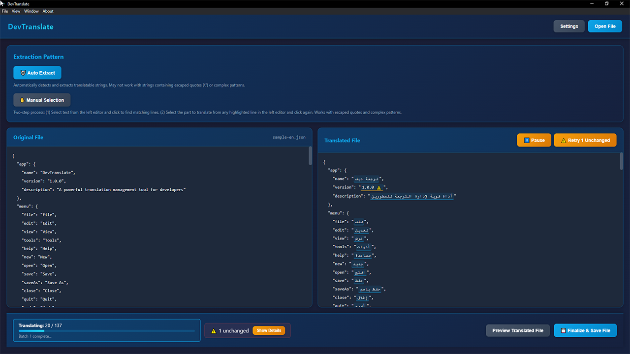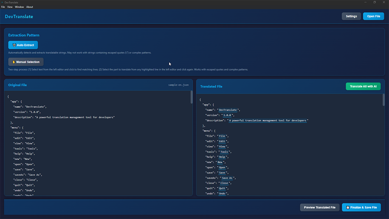 The app extracts only the translatable content and keeps everything else exactly as it is. This ensures your translated files remain valid and ready to use in your projects without extra cleanup or debugging.