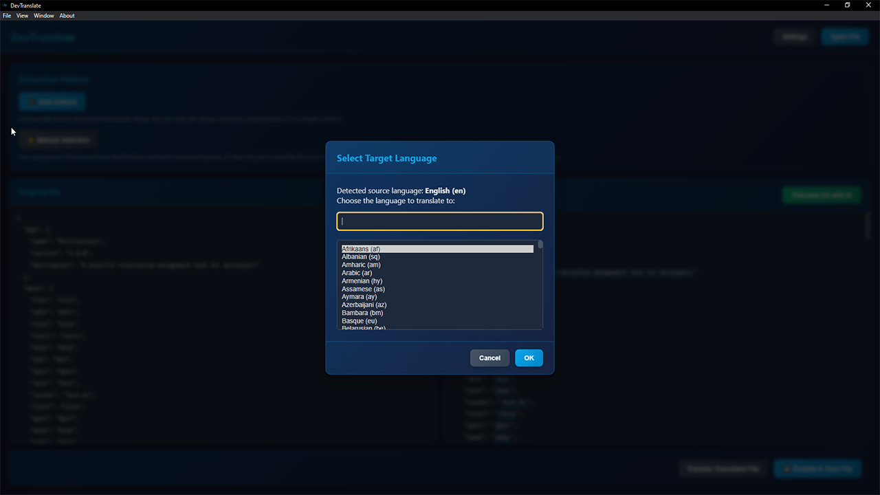 The app automatically detects and extracts translatable strings from supported file types. For edge cases, you can manually define patterns to ensure only the correct text is selected.