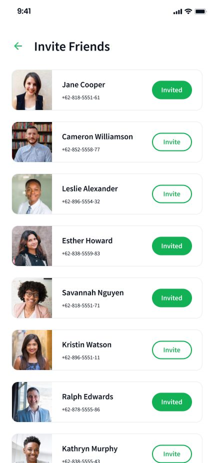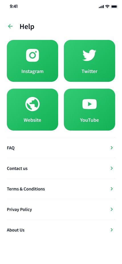 - Settings (Personal Info, Notification, Security, Language, Invite Friends, Help Center, About, & More)