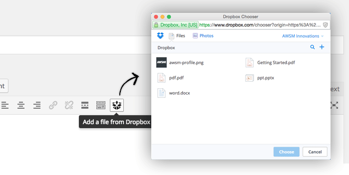 The Dropbox WordPress Plugin – Dropr lets you access files from your Dropbox account and help you to add them straight to your WordPress website. Securely and safely.