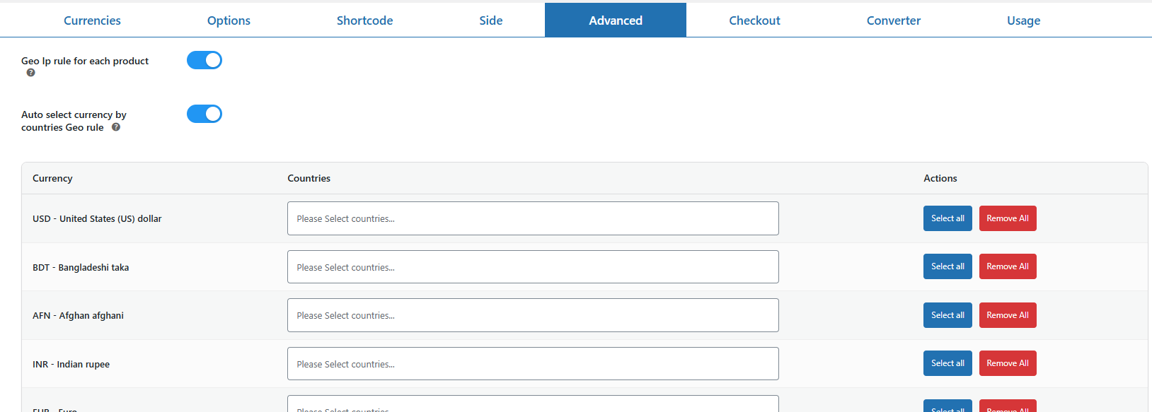 - Auto Select Currency by Geo IP – Automatically convert currency based on the visitor’s country. WooCommerce and Auto Select Currency must be enabled.