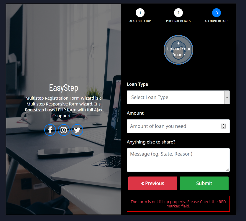 EasyStep is a Multistep Ajax Advanced Registration / loan Form Wizard. This script included with PHP, MySQL, Ajax, jQuery, Bootstrap 4 with Required field jQuery & PHP validation. This script is fully secure with Anti spam (google reCHAPTCHA). all codes were written in a simple way which can easily integrated any PHP project. It’s also full Ajax supported with image upload and mail functions. It can be easily customized as it is well documented and developed using the latest web technologies. This form will be a perfect choice for all registration, & loan based websites / projects.