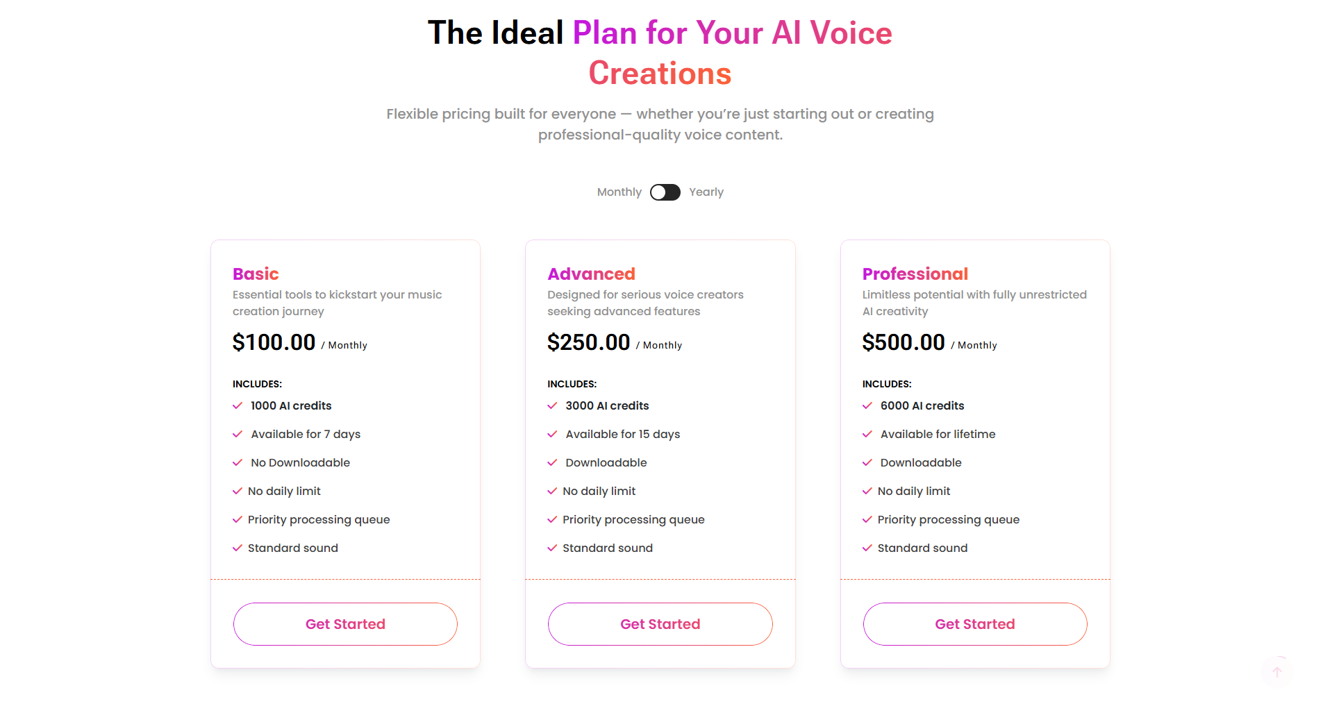 – Subscribe to flexible monthly or yearly plans with credit-based voice generation limits
