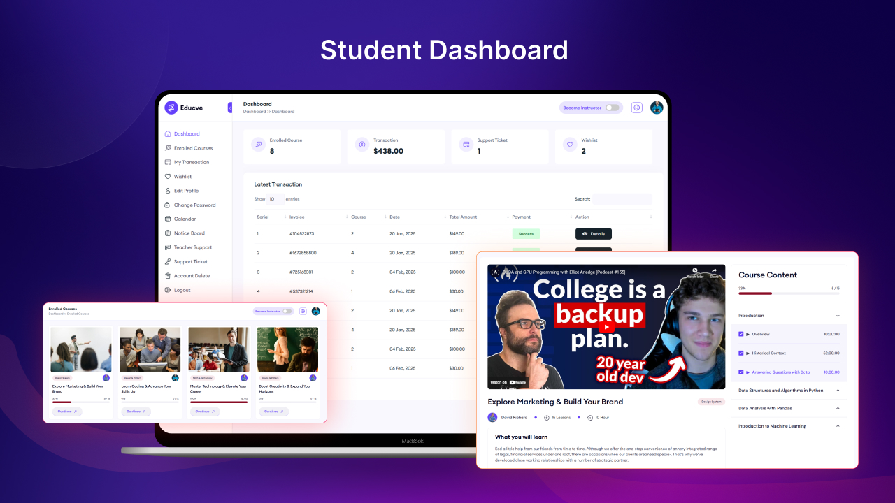 Educve LMS – Learning Management System is engineered to adapt to the evolving demands of online Learning, providing advanced functionalities and customization options to suit your unique requirements. Which is specially made for academy, ai, education, Edulab, Laravel e-Learning software, lms, module lms, online professional course, Organization LMS, paypal, skillshare, stripe, tutor lms, udemy, zoom