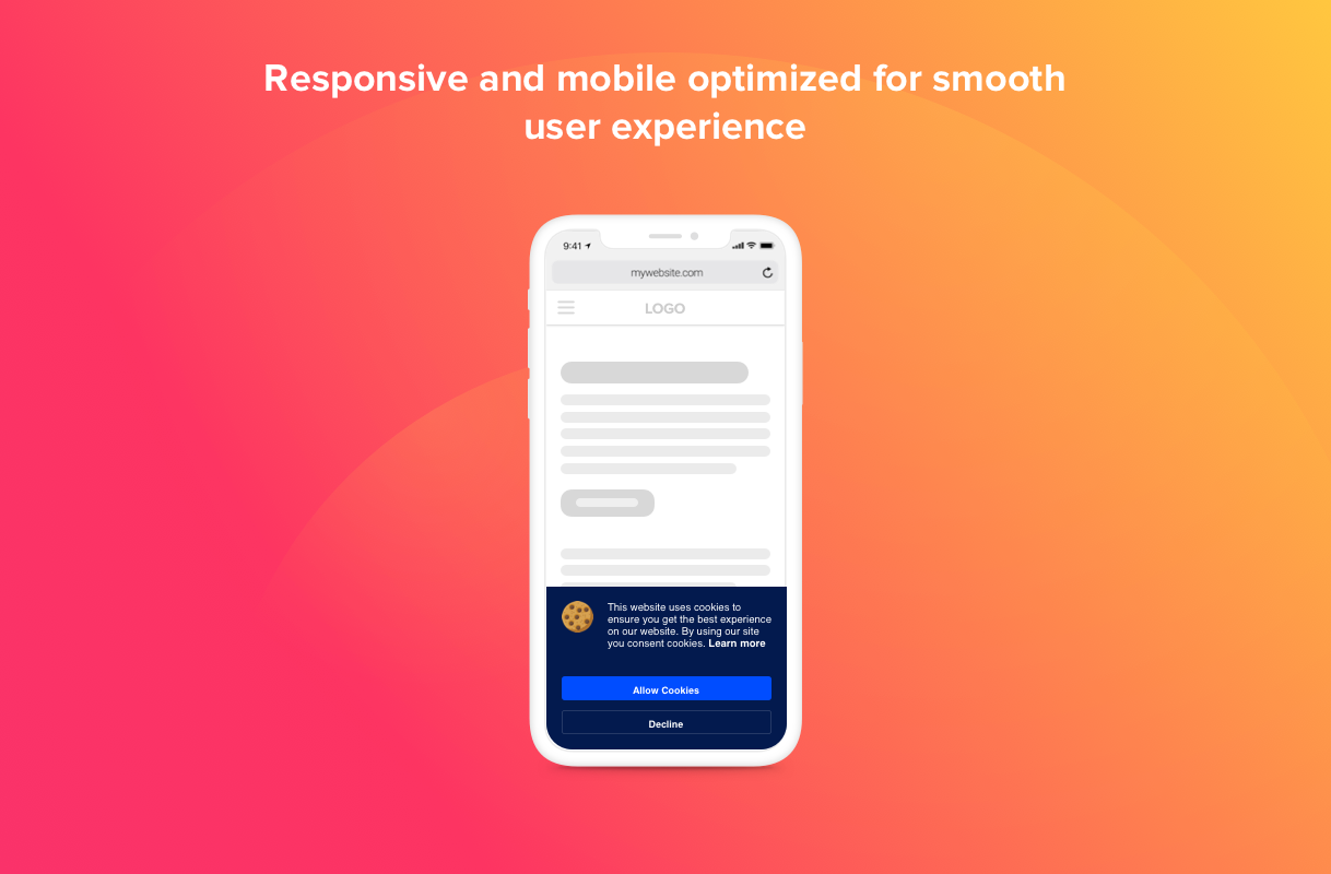 With Elfsight Cookie Consent widget, it’s maximum easy to notify users that your website uses cookies via a popup bar. The widget enables you to write your message, provide a link to your website-use policy, and add buttons to get consent from users. You can choose to show the widget as a bar or a box and select any position on the page. Also, color options will help you make it native and match the website style.