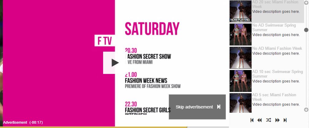 Elite video player also supports custom advertising as pre-roll (before), mid-roll (during), post-roll (after) and popup Ads. This means you can have your own videos on server and serve them as you wish without having any external xml files. Ads can be added to each video. Also, advertising is improved with custom skip ad option, which means that you can set different skip time for each video. Each ad can be added for all videos that elite player supports: youtube single videos/youtube playlists/user channels, vimeo videos, and self-hosted mp4 videos. Custom Advertising can be combined with VAST, VMAP and IMA Ads as well.See Custom Advertising examples.