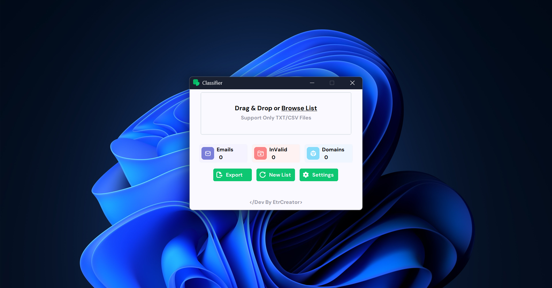 - Highlighted Features: - Upload .txt or .csv email lists - Automatically filter out invalid or malformed email addresses - Classify emails by domain and save into : gmail.csv , hotmail.csv , yahoo.csv …and more!