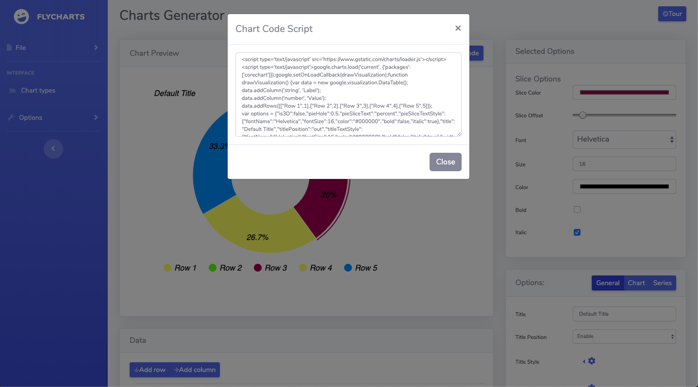 FlyCharts allows you to create different types of charts like Pie chart, Line chart, Bin chart and others. You can easily configure them to get the results you need. You may create as many charts as you want. The final result can be downloaded directly as image or you can use javascript embed code to show the chart. Check out the live preview and all the features below.