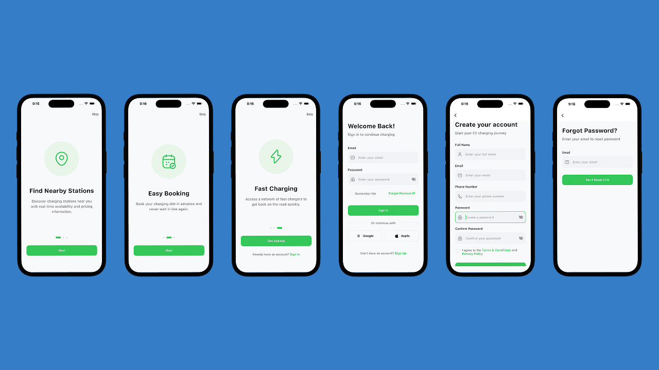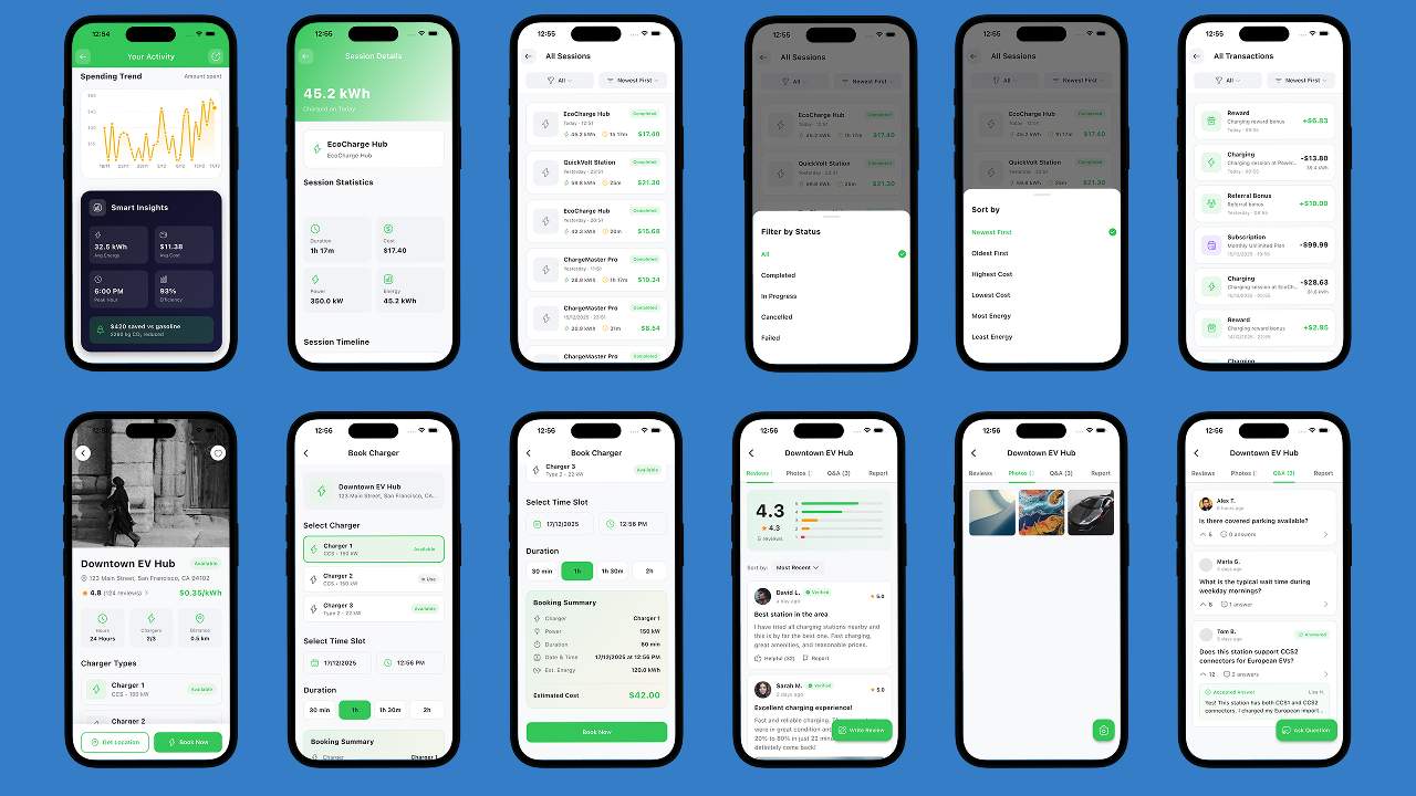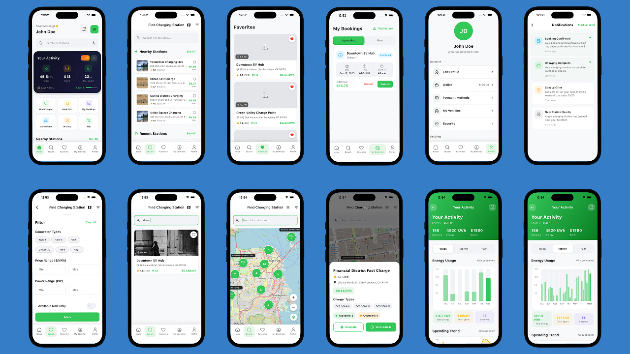 A modern EV charging user application that allows customers to discover charging stations, book sessions, manage trips, and track charging history with a smooth and intuitive UI.