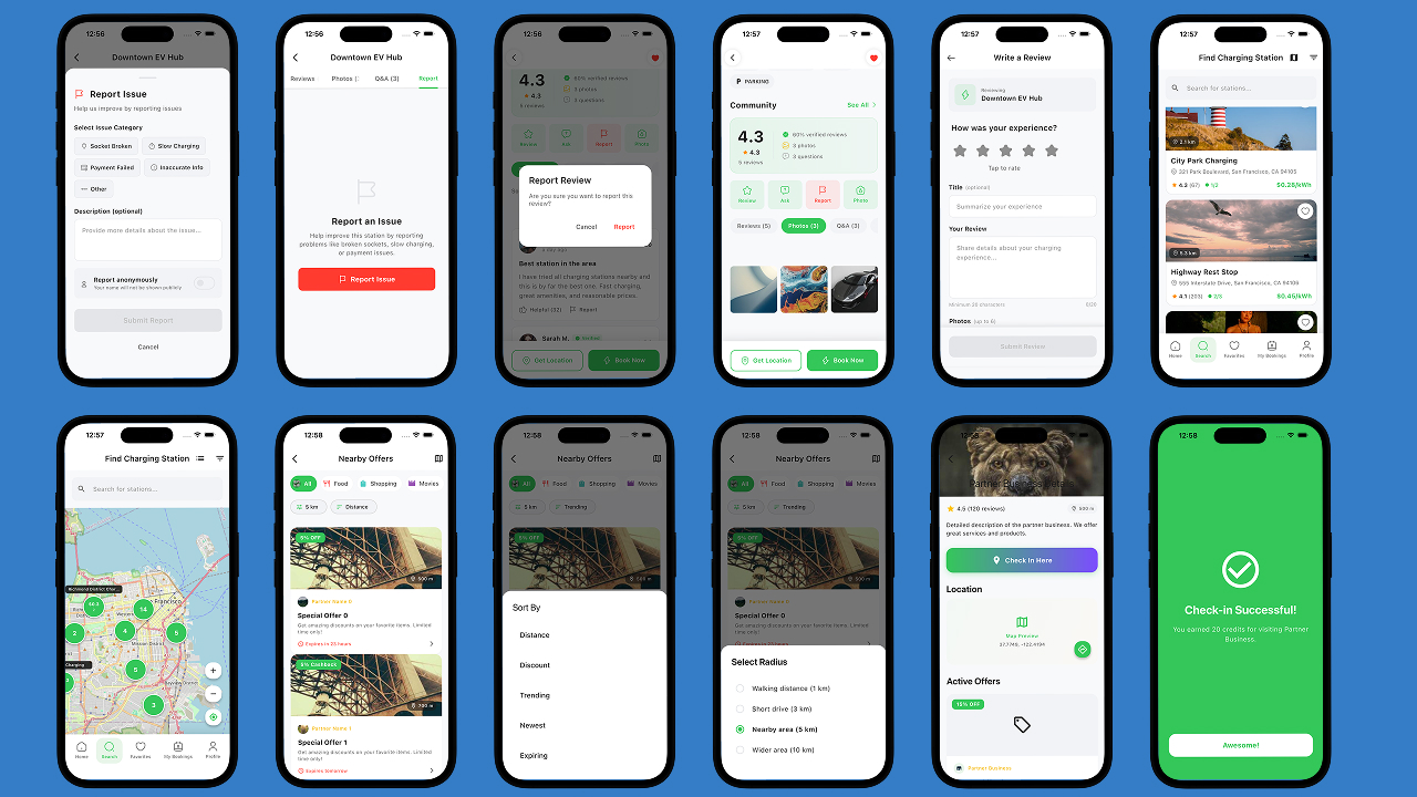 - Charging Station Discovery – Nearby stations with filters, real-time availability, and map view