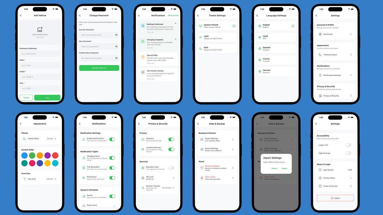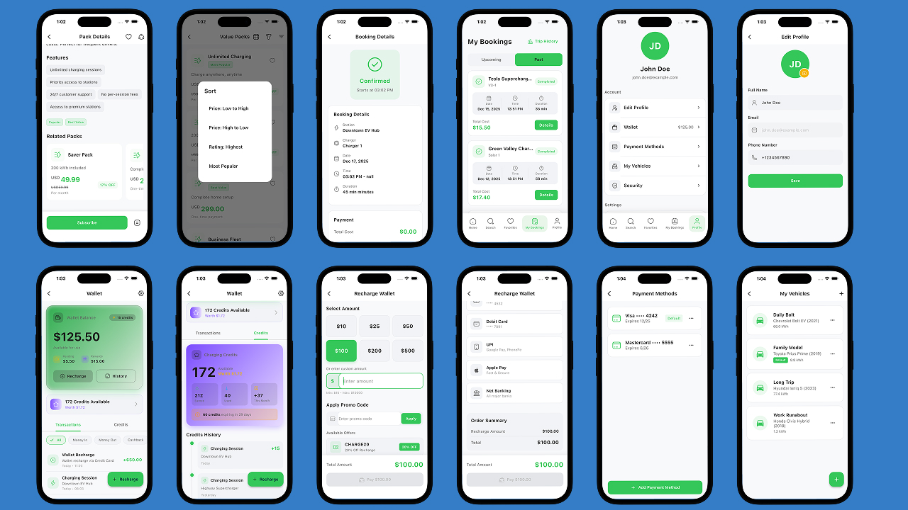 - User Profile & Vehicles – Manage EVs, payment methods, and preferences