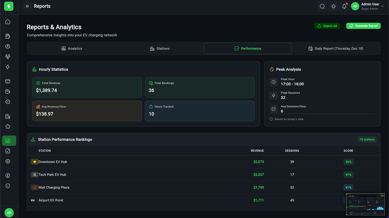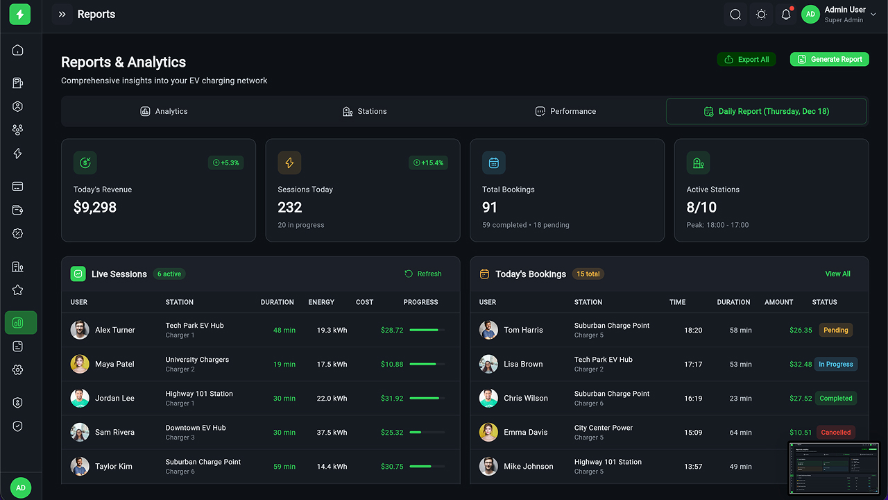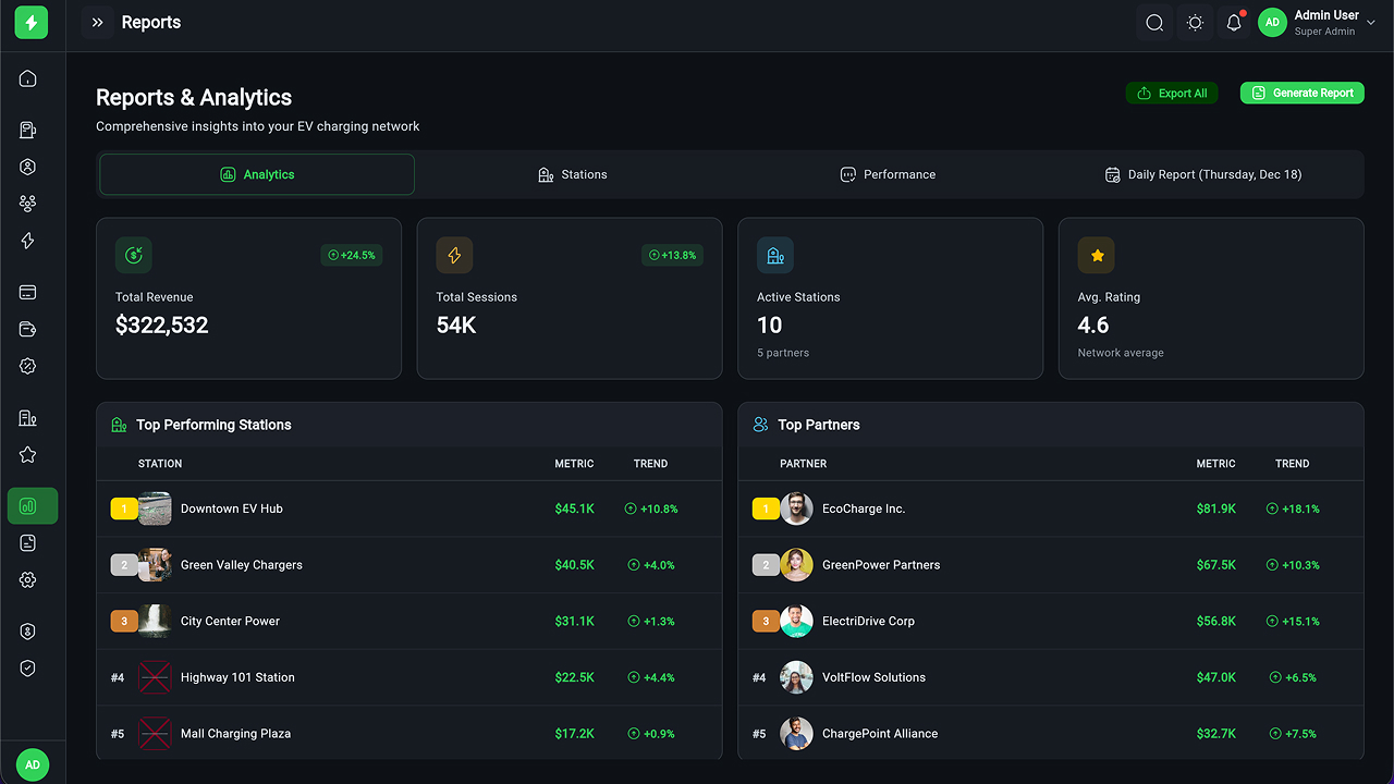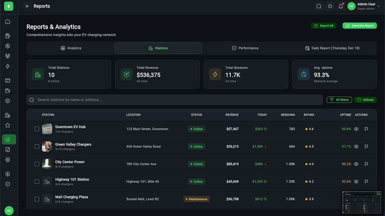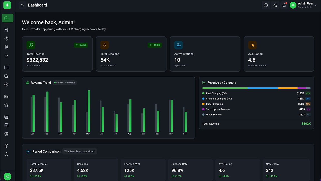 - Executive Dashboard – Revenue, sessions, station health, KPIs, and analytics