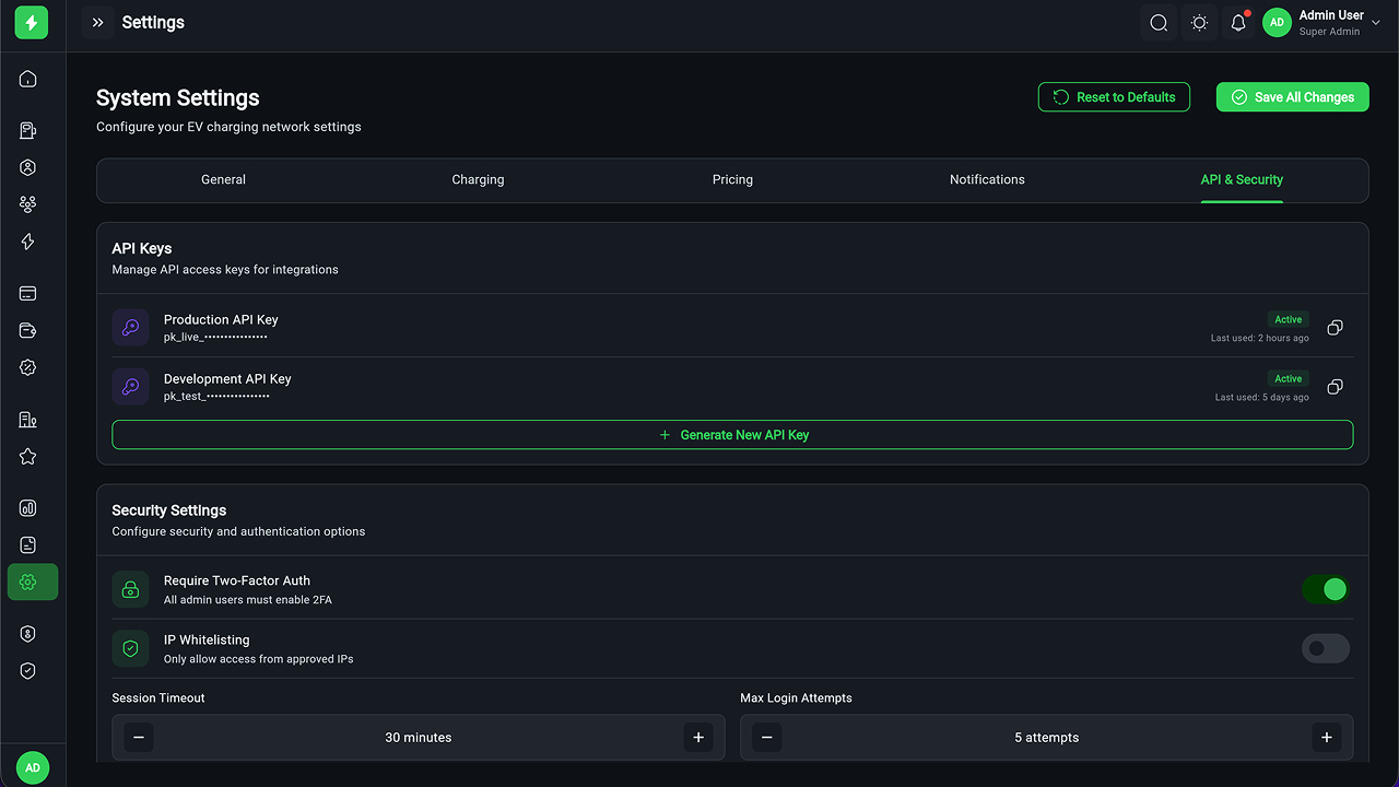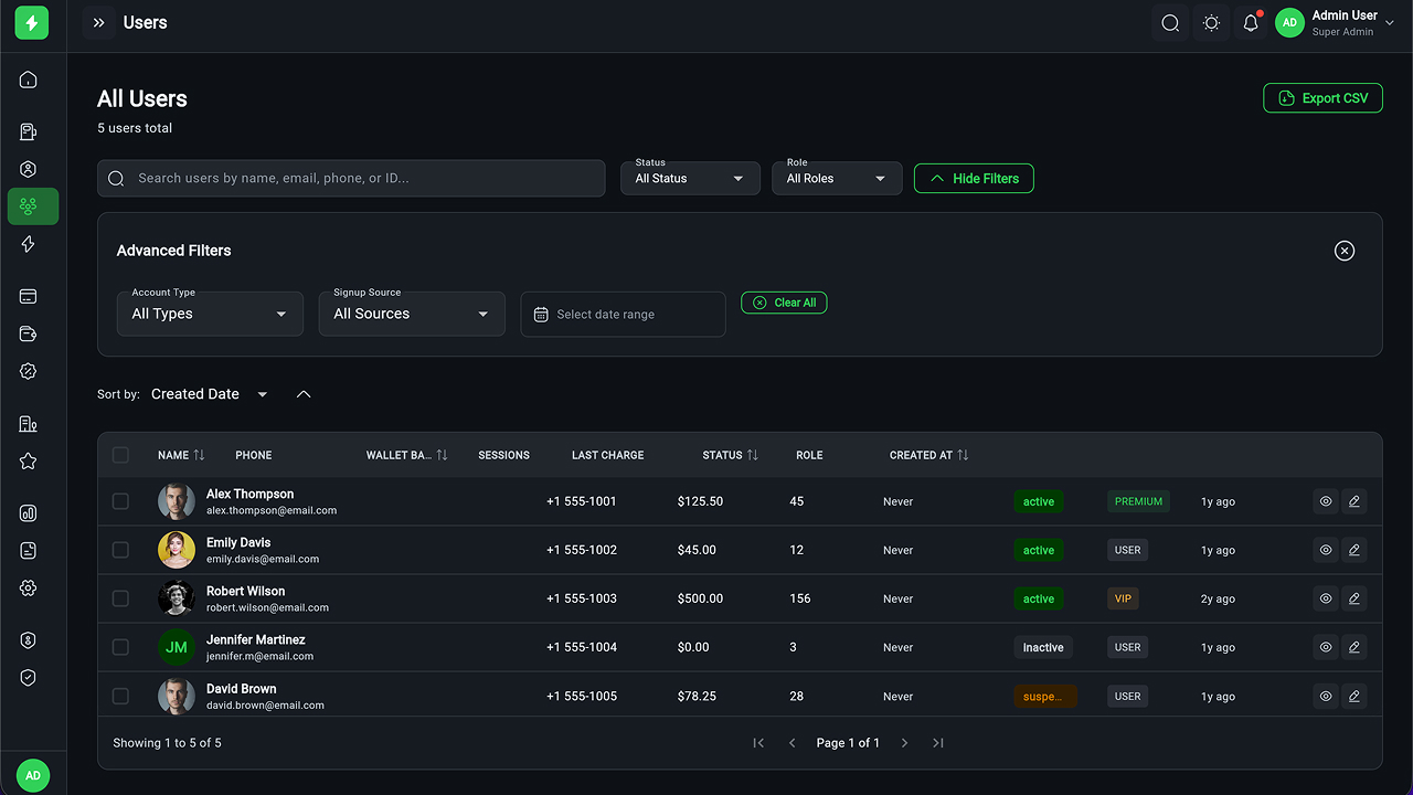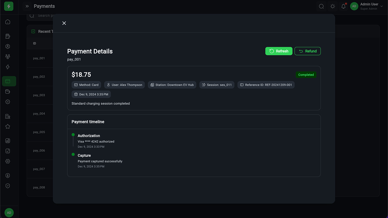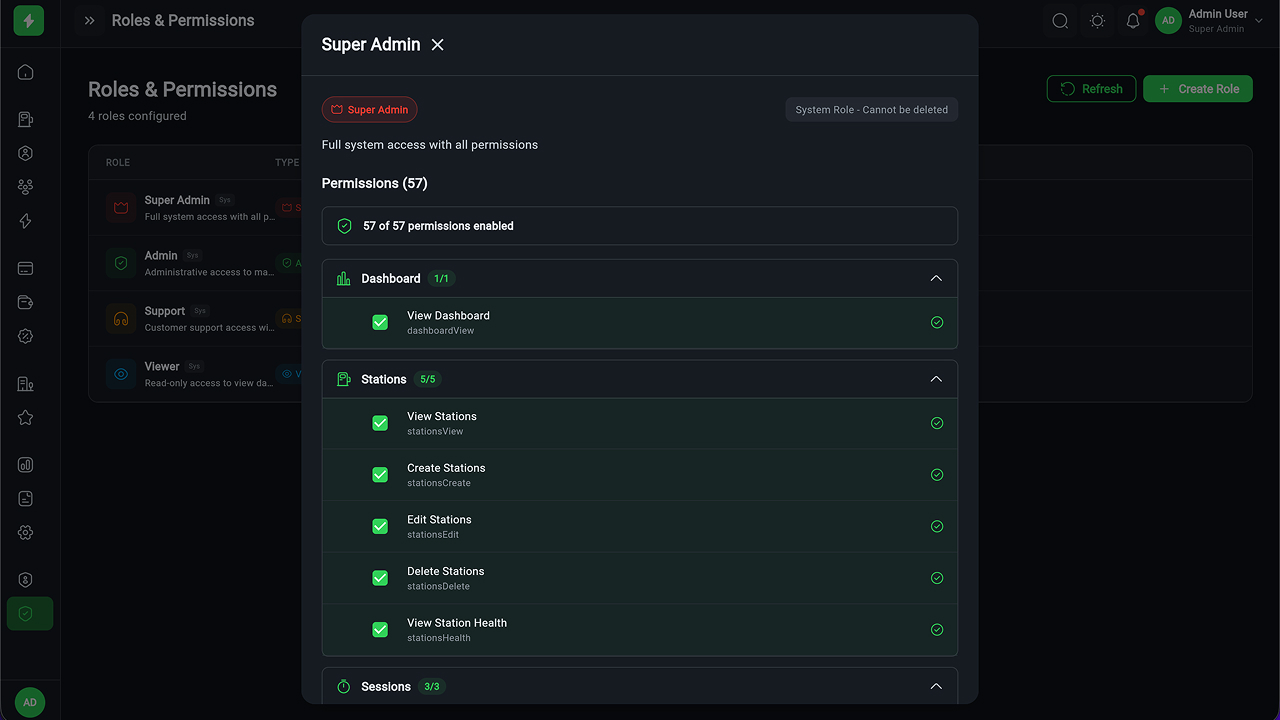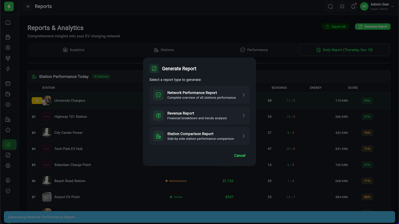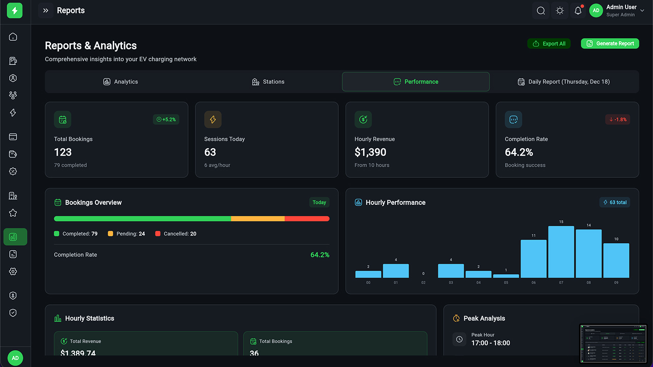 - Executive Dashboard – Revenue, sessions, station health, KPIs, and analytics