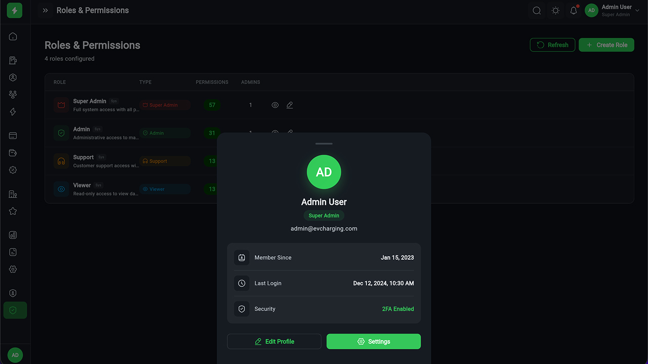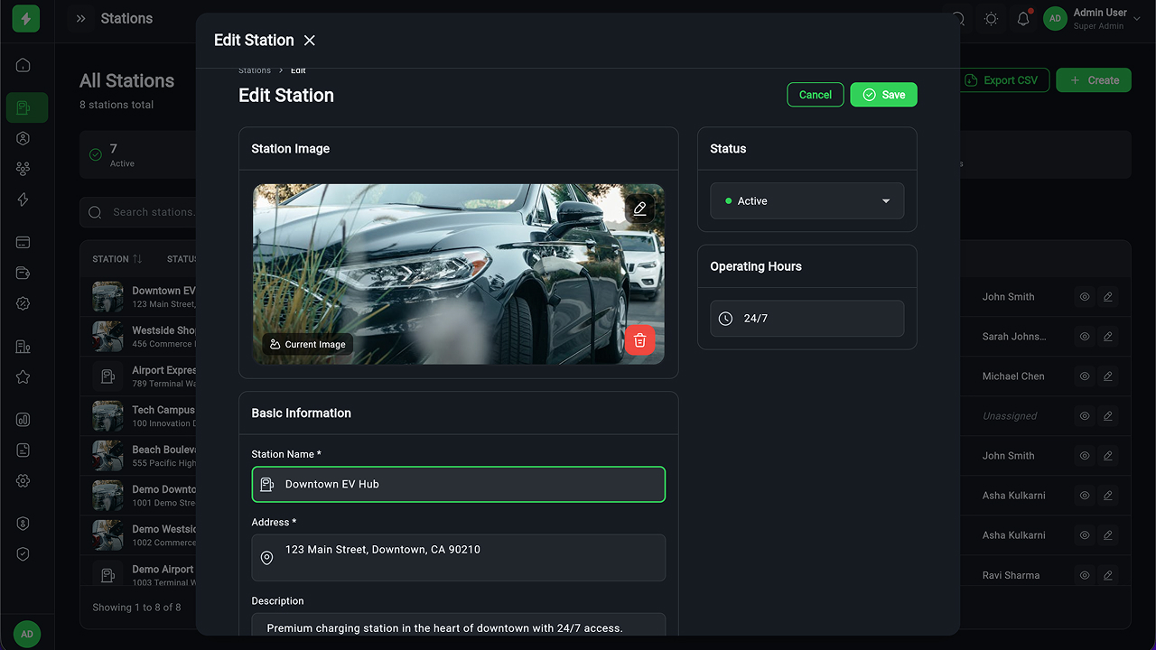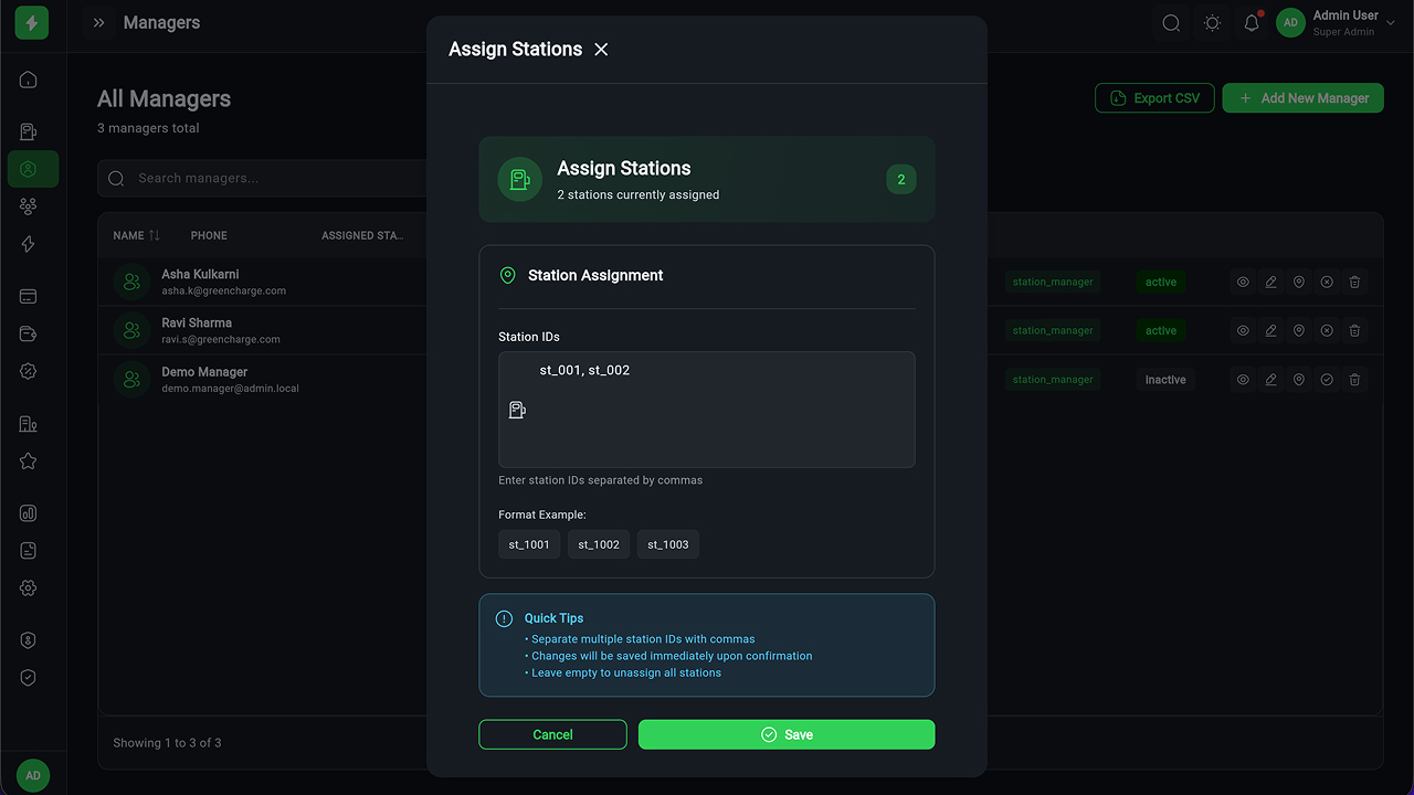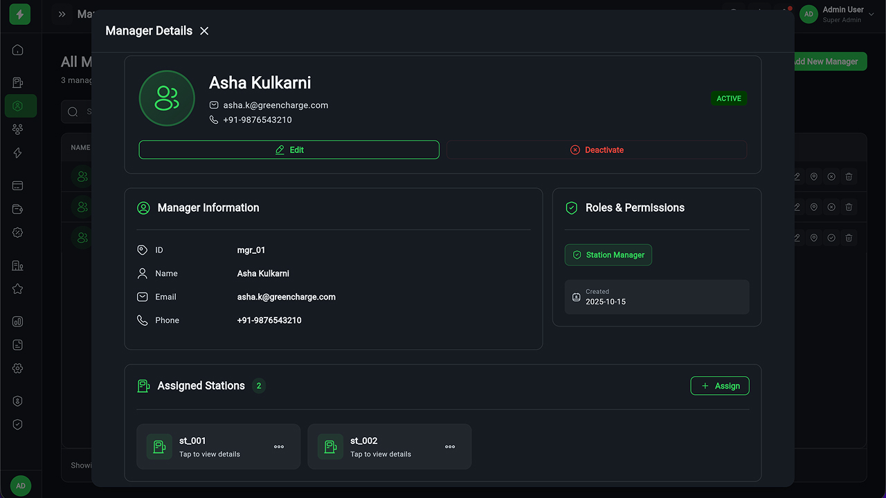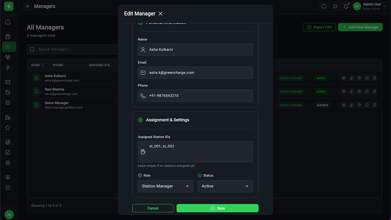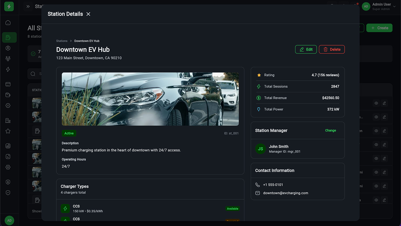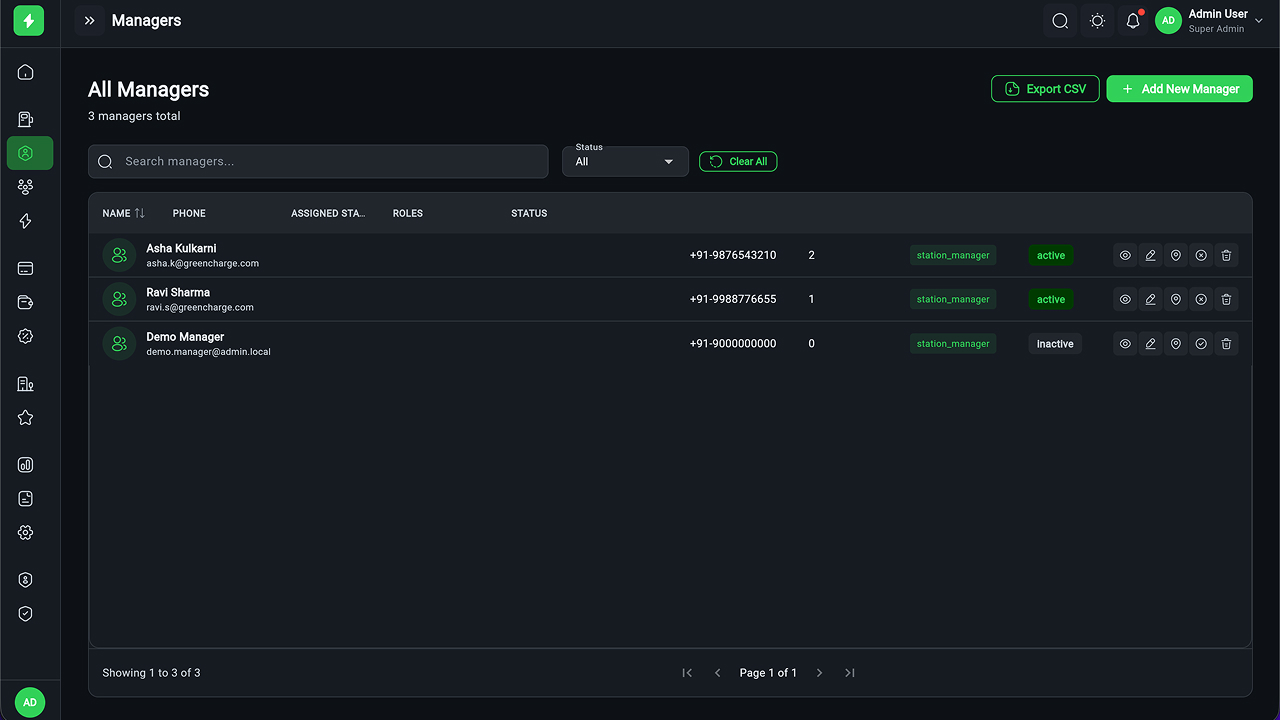 - Charging Station Management – Full CRUD, manager assignment, status tracking