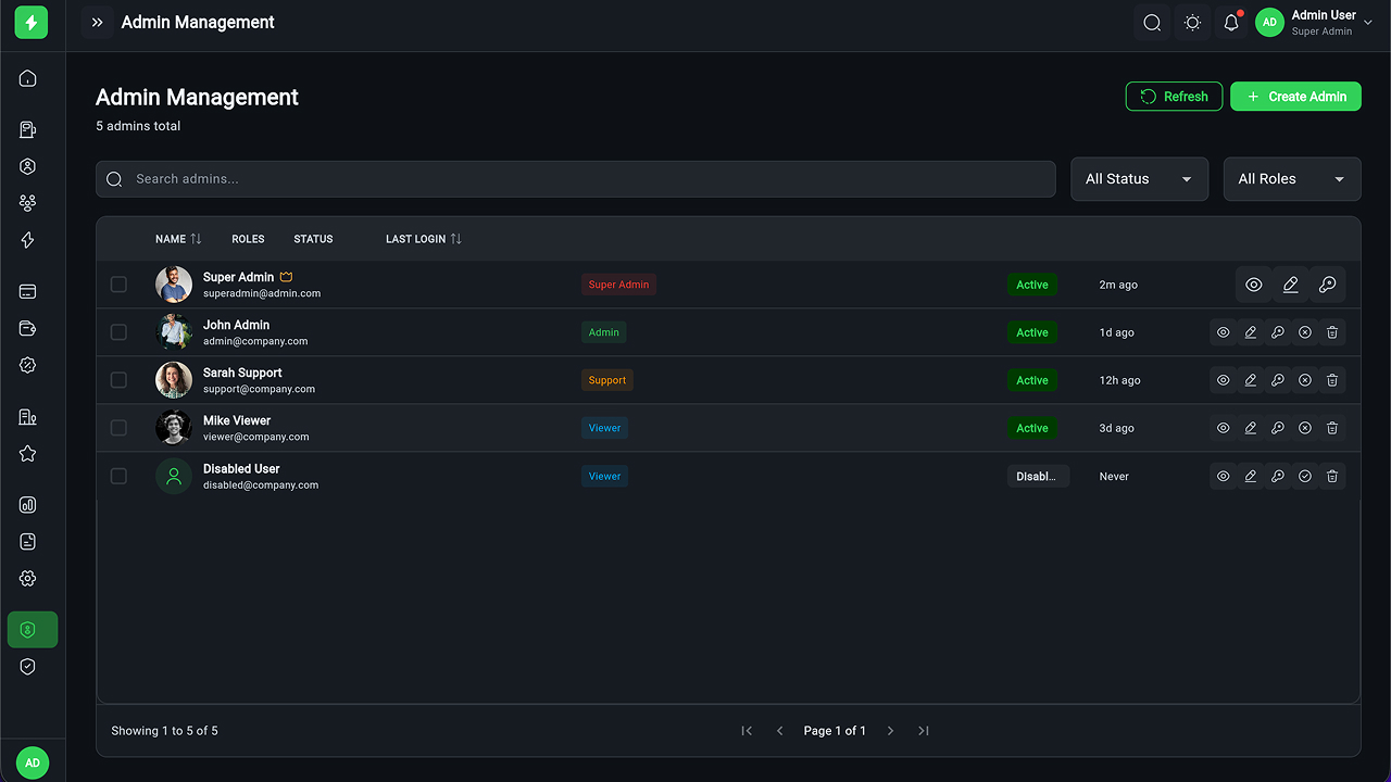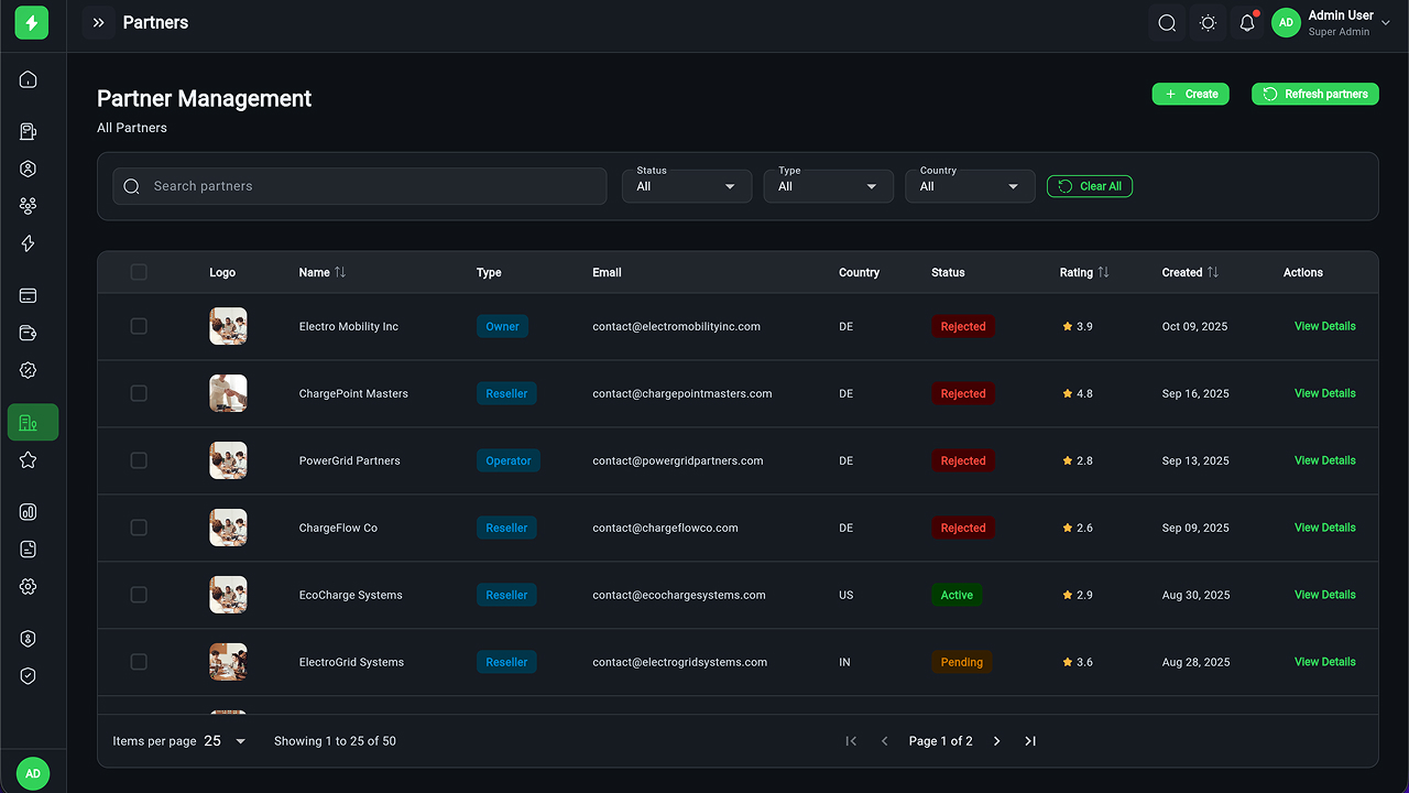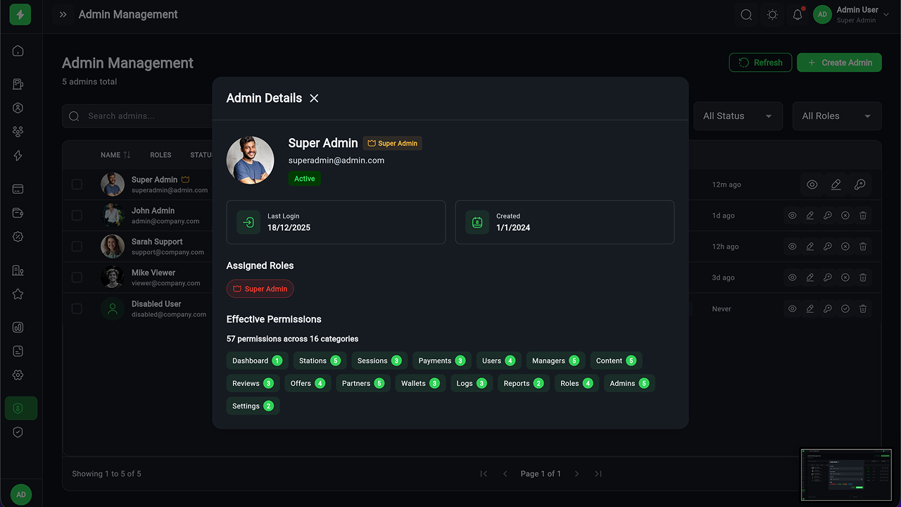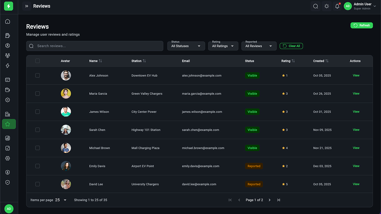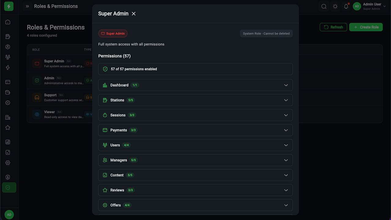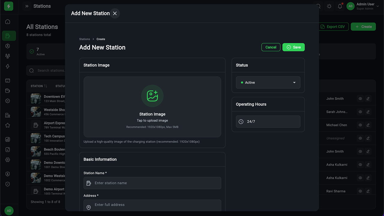 - Charging Station Management – Full CRUD, manager assignment, status tracking
