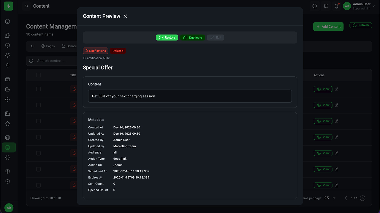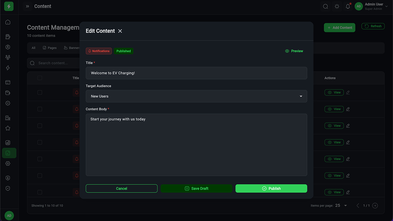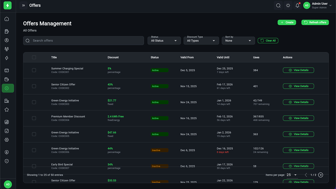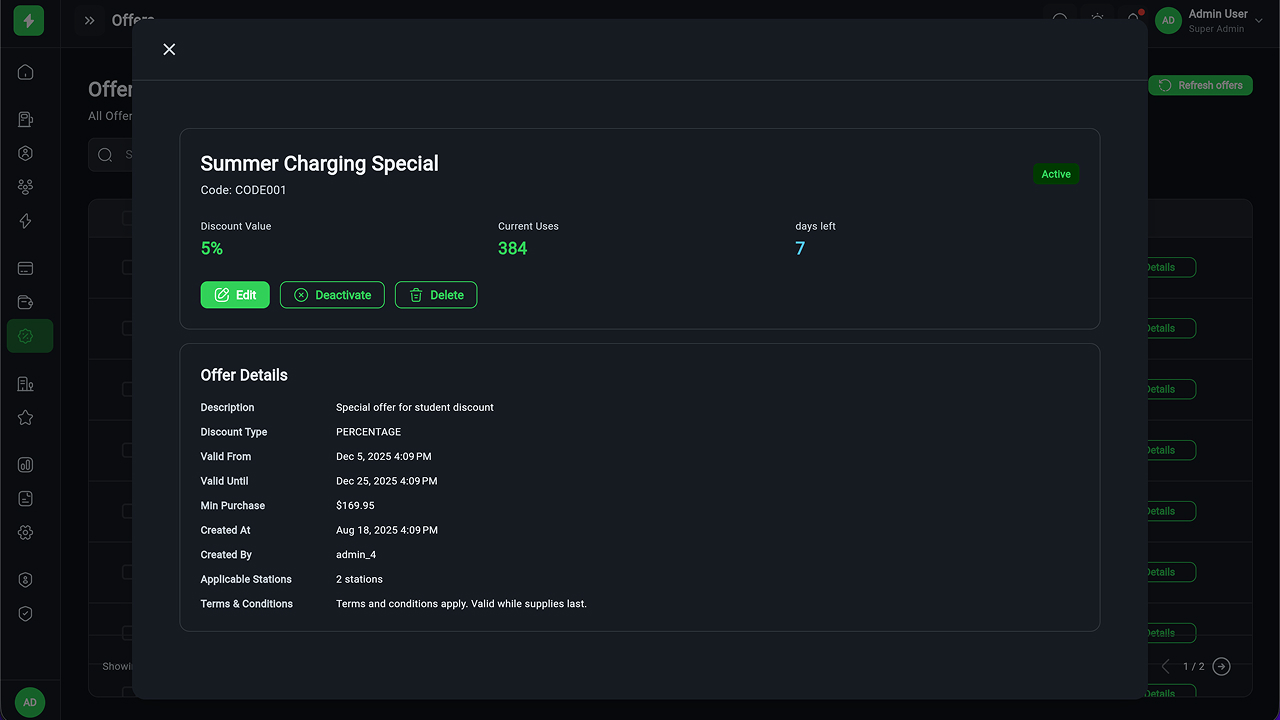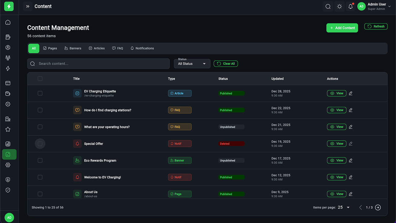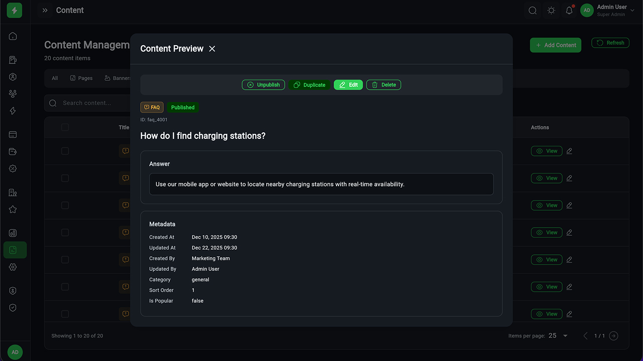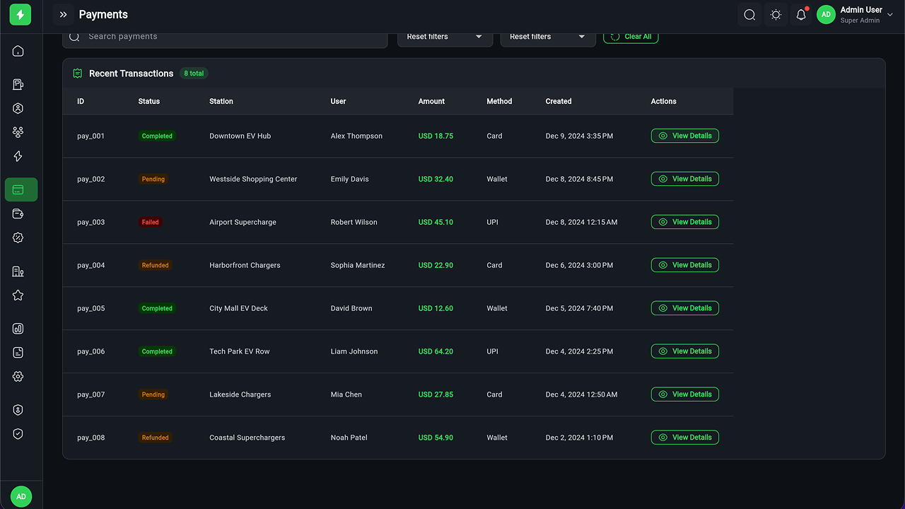 - Charging Station Management – Full CRUD, manager assignment, status tracking