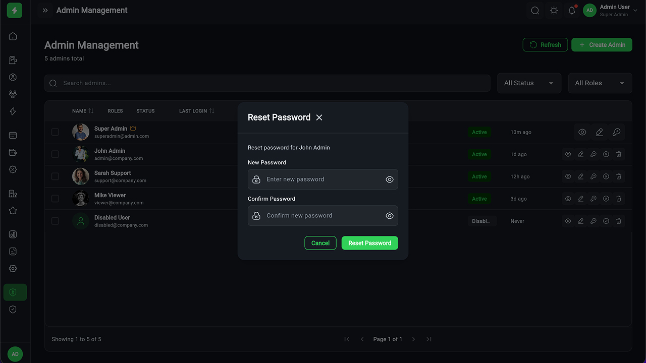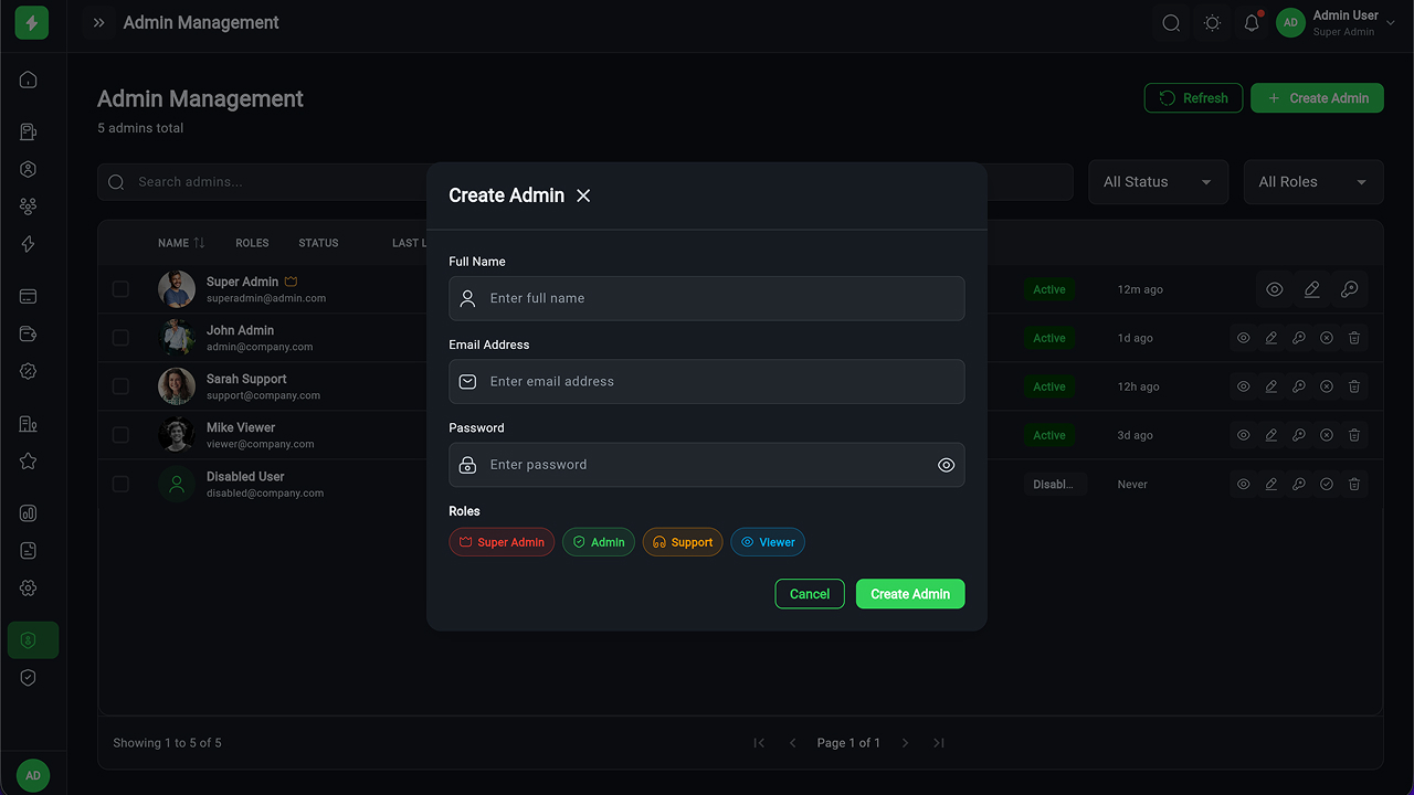 A fully responsive Flutter Admin Web Panel to manage EV charging operations, stations, users, payments, sessions, analytics, and roles – all from a single dashboard.