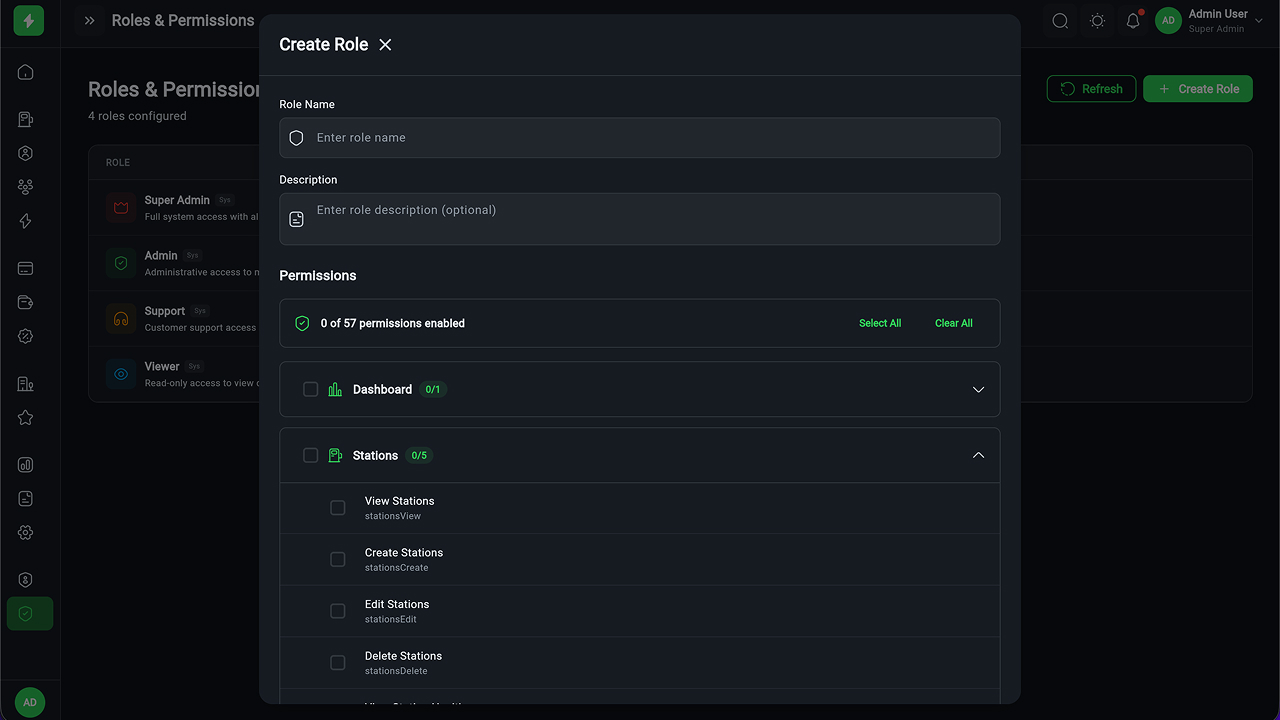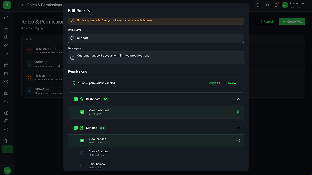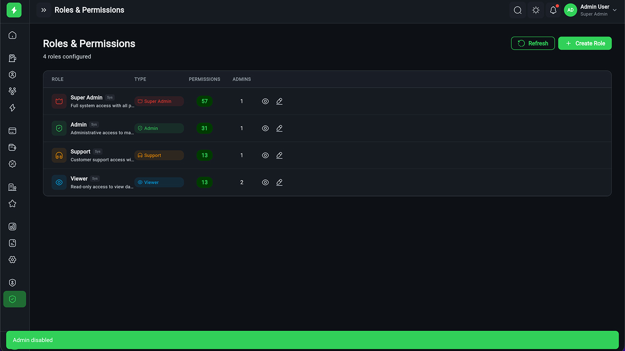 - Multi-Role Authentication (RBAC) – 50+ fine-grained permissions with role matrix