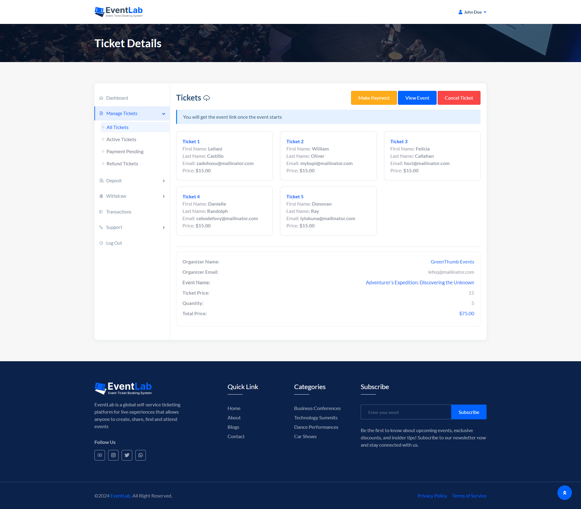EventLab, a Smart & Exclusive Events ticket booking marketplace, comes with Huge automation with Automated payment, organizer Panel, Digital Notification, Profile followers, Secure Transactions, and more. No Monthly Fees, No Hidden Charges, and No Encryptions. comes with a lifetime, and affordable price. EventLab comes with all the essential features required to automate your Events ticket booking business globally. Discover a cutting-edge platform for a seamless Event ticket-selling business. Engage in the dynamic admin panel, simplify purchases, and enjoy secure transactions. Effortlessly connect with social login and choose from multiple payment options. Join us for a smarter, safer, and more engaging digital experience. Get ready to experience the ultimate thrill of a ticket Selling Marketplace business website with EventLab! Explore inbuilt features designed to elevate your experience.