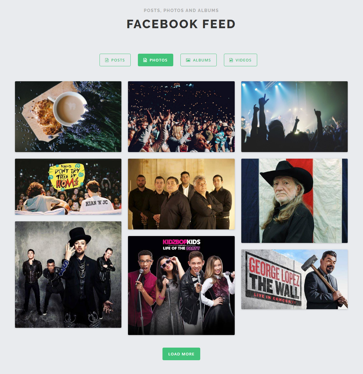- Facebook Feed (Posts, Photos, Albums and Videos).