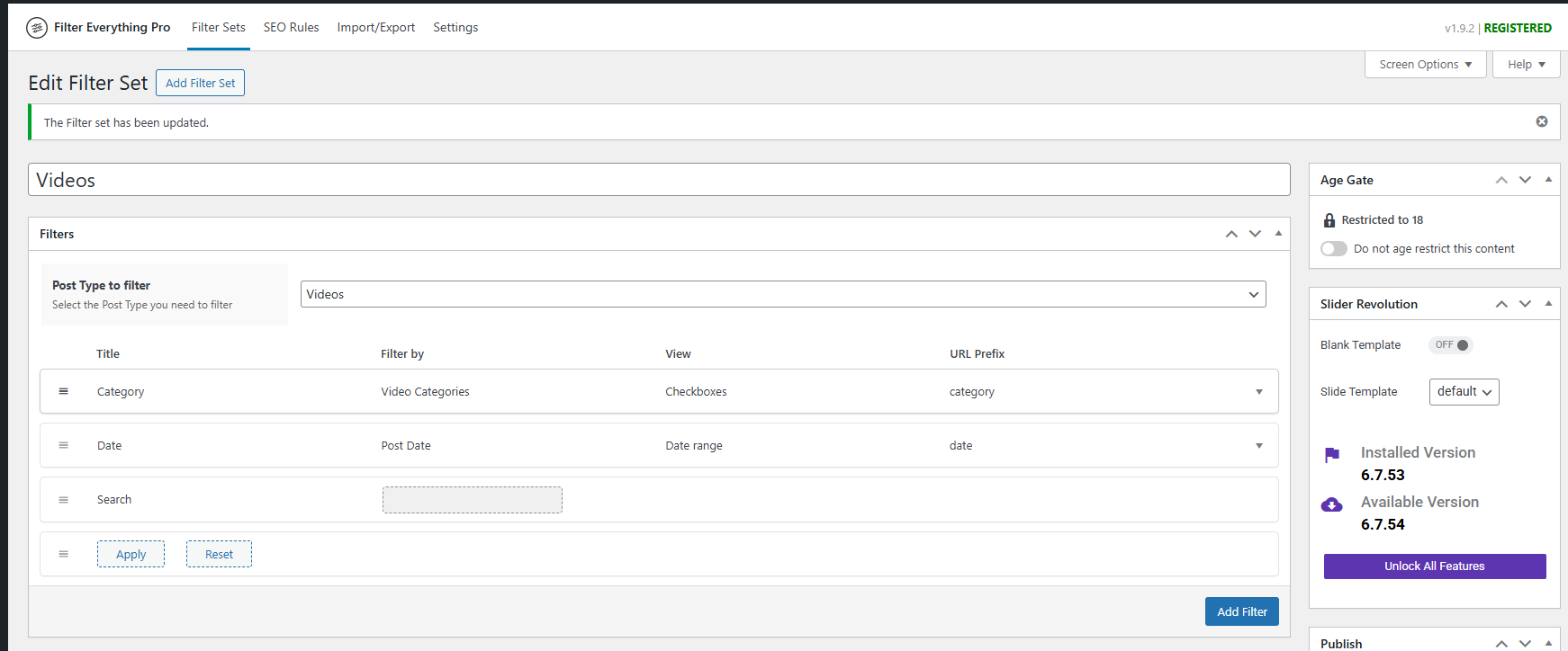 Hi, I had designed a structure of filter sets which was working perfectly in a dev environment but not the page is live and it has stopped working. The page shows this: “There are no filters in the Filter Set yet. Please add them to the Filter Set related to this page.” I can’t understand why. I have this license 0d063445-f69e-44f1-b9a4-f3ab51f0a714 and Wordpress says it is invalid. This is the page: https://mcrit.com/projects/