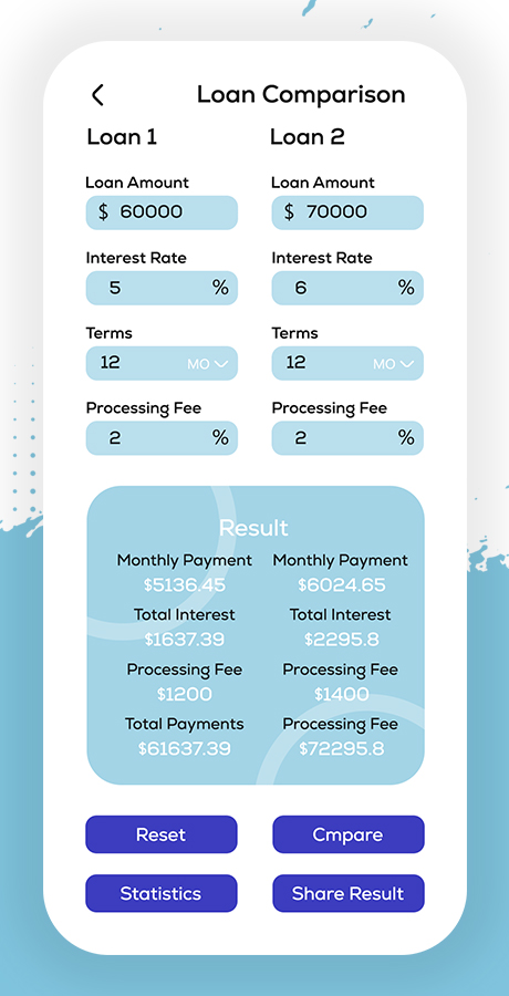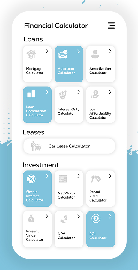 **Financial Calculator & Investment Calculator app offers best tools : - Auto Loan Calculator - ROI Calculator (Return on Investment Calculator) - Amortization Calculator - Loan Comparison Calculator, EMI Calculator - Interest Only Calculator - Loan Affordability Calculator - Car Lease Calculator - Simple Interest Calculator - Net worth Calculator - Present Value Calculator - NPV Calculator - Rental Yield Calculator - Loan Calculator, Compare two loans