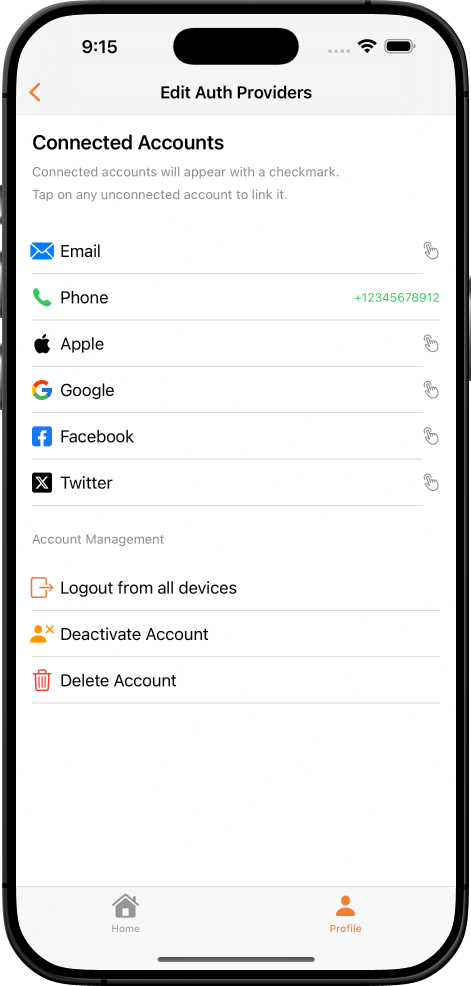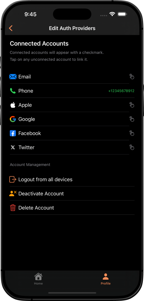 - Provider Linking: Connect and manage multiple authentication methods for single user account