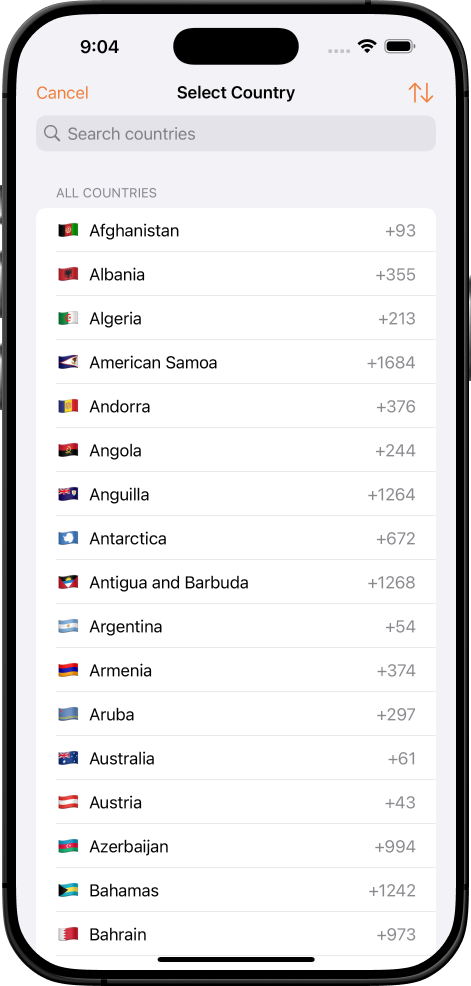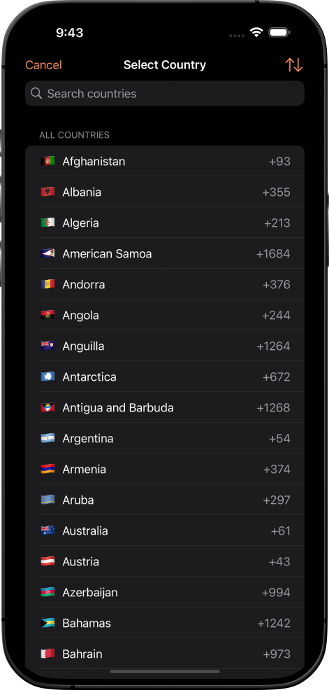 - Country list with flags and dial codes (195+ countries)