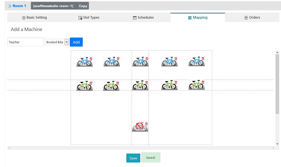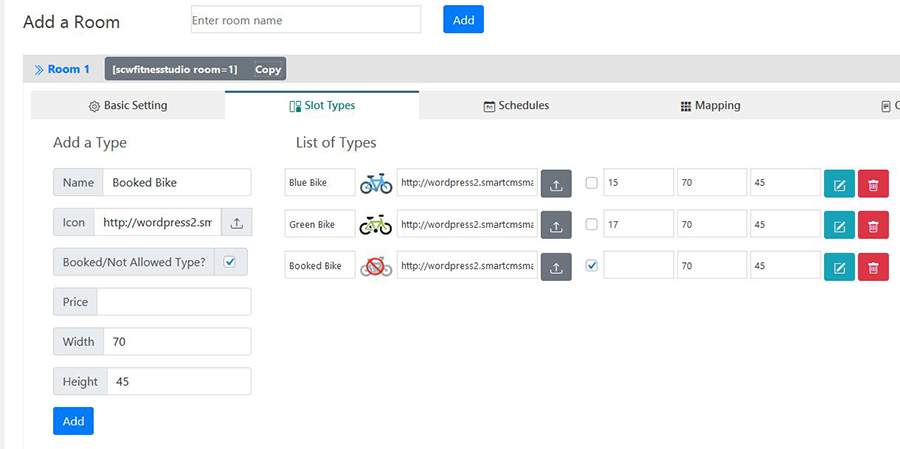 - Slot Types: Admin can add/modify/delete the type of machines, includes name of type, upload icon, choose if it’s booked/not allowed type, price, width and height.