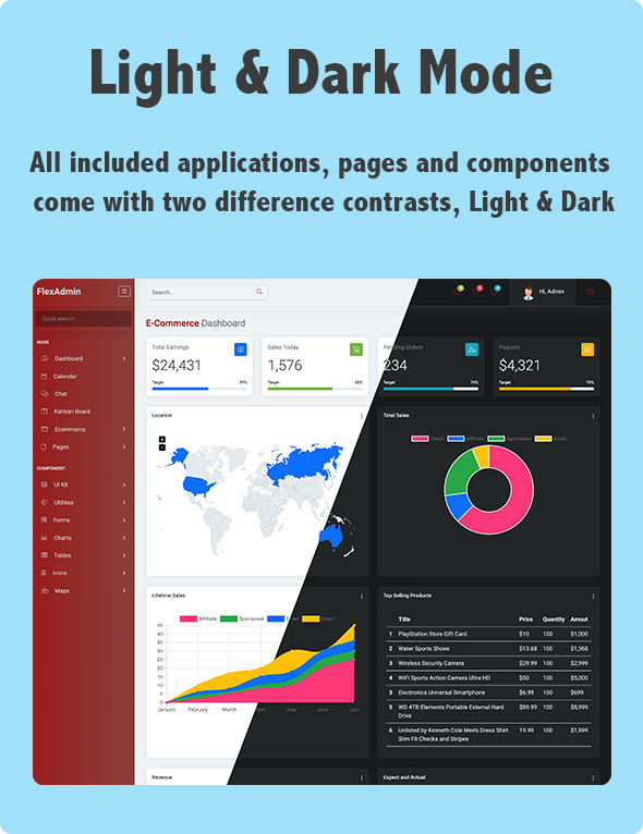 FlexAdmin is a fully featured premium admin template built on top of awesome Bootstrap 5.3.1. It’s crafted using modern web technologies HTML5, CSS3, and jQuery. The theme includes a beautiful dashboard, many ready-to-use handcrafted components, widgets, pages, etc. The components can be used very easily on any page.