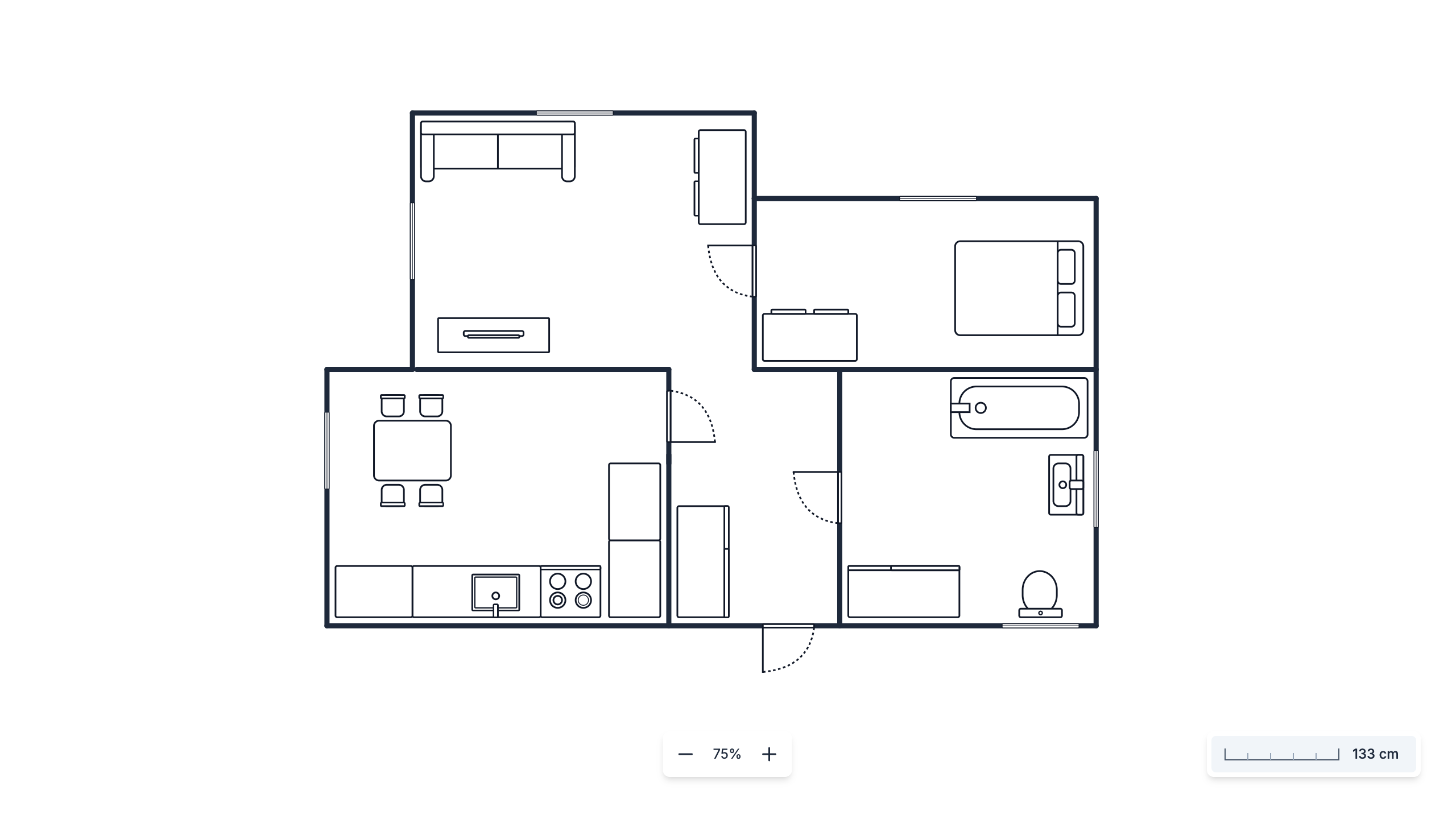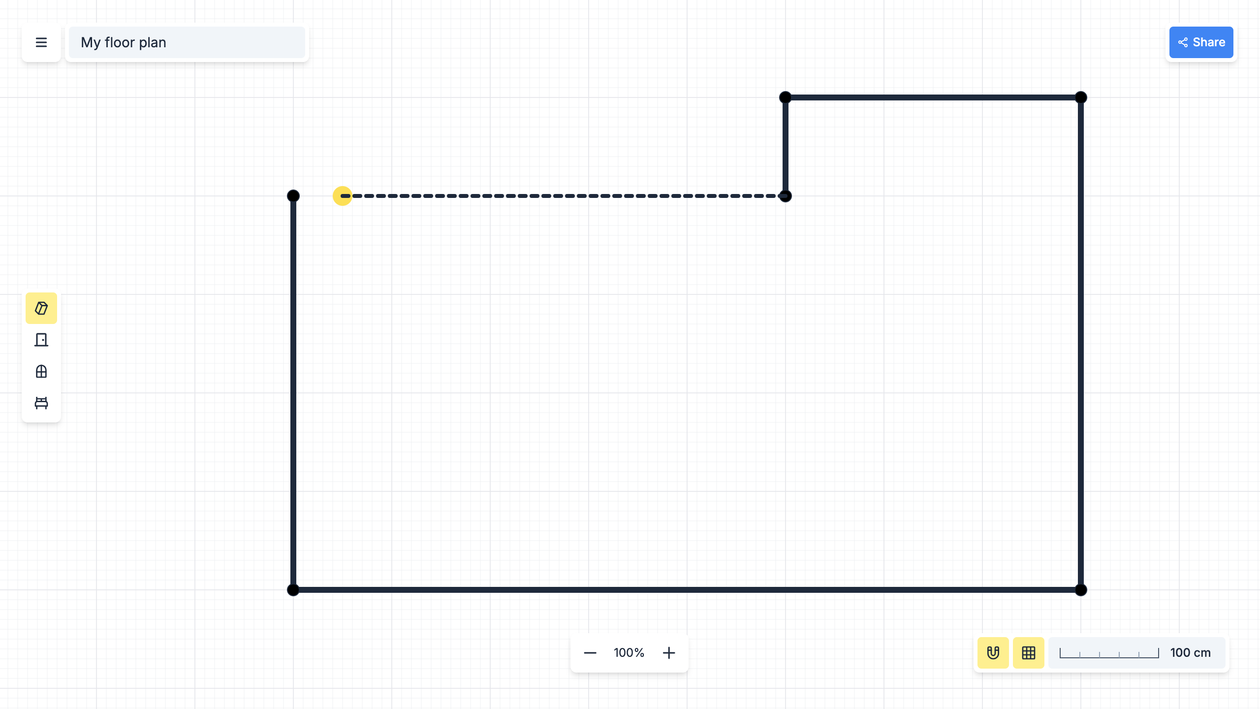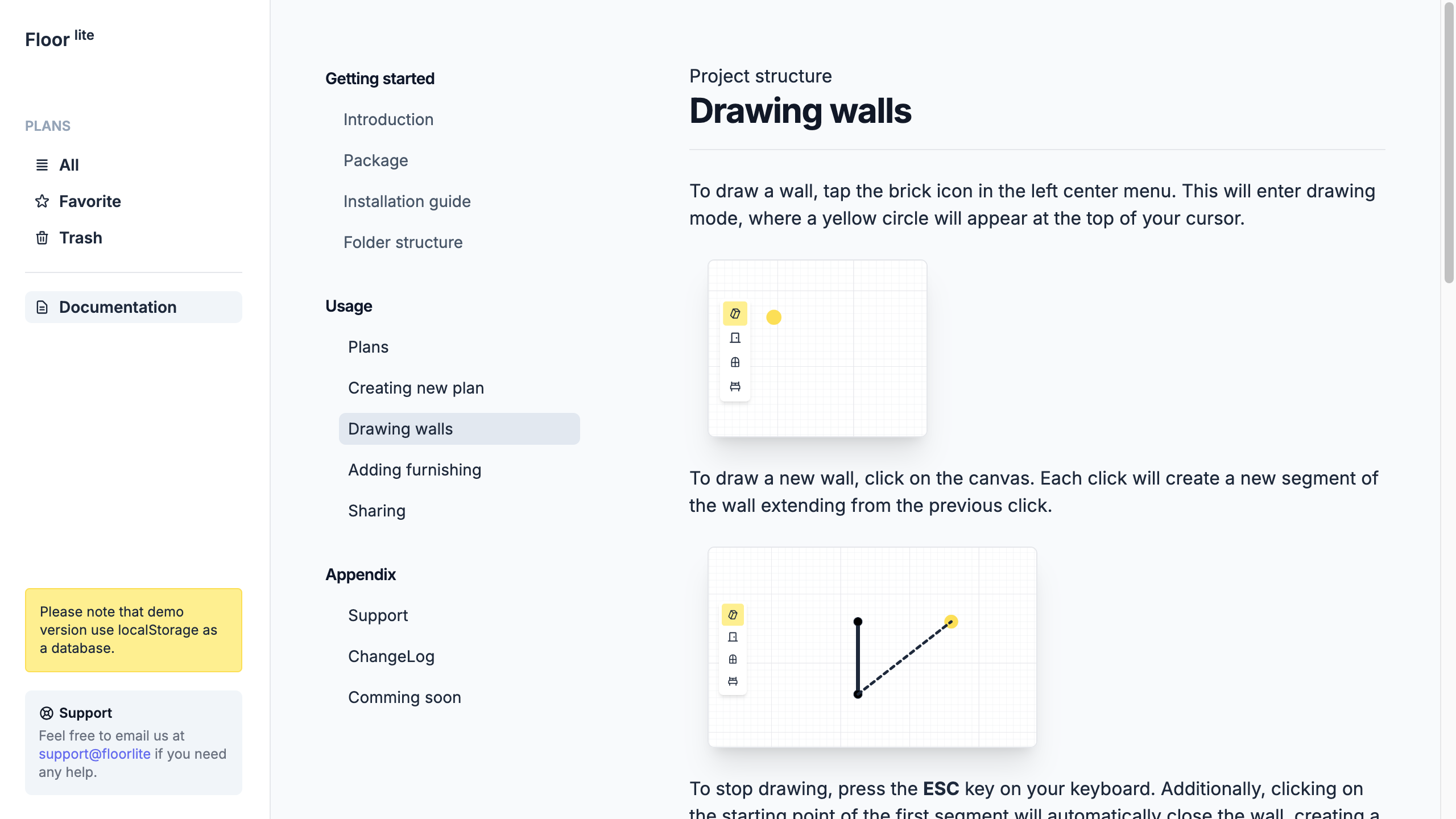 Version 1.2.0 - (October 8, 2024) -------------------------------- * Fit to view: When the plan initially loads, the view will automatically adjust to fit within the walls. The same "fit view" functionality can also be activated by clicking on the percentage value in the zoom controls. * Measure Wall Segment: By drawing a wall, a new measurement line is created to display the length of the wall. * Text Element: A new text element is available for labeling rooms or adding simple annotations. * Unit Length: You can now change the unit of measurement. The available options are centimeters, inches, and feet. * Library Expansion: Two new flower items have been added to the library.