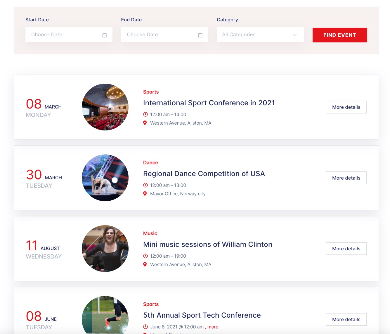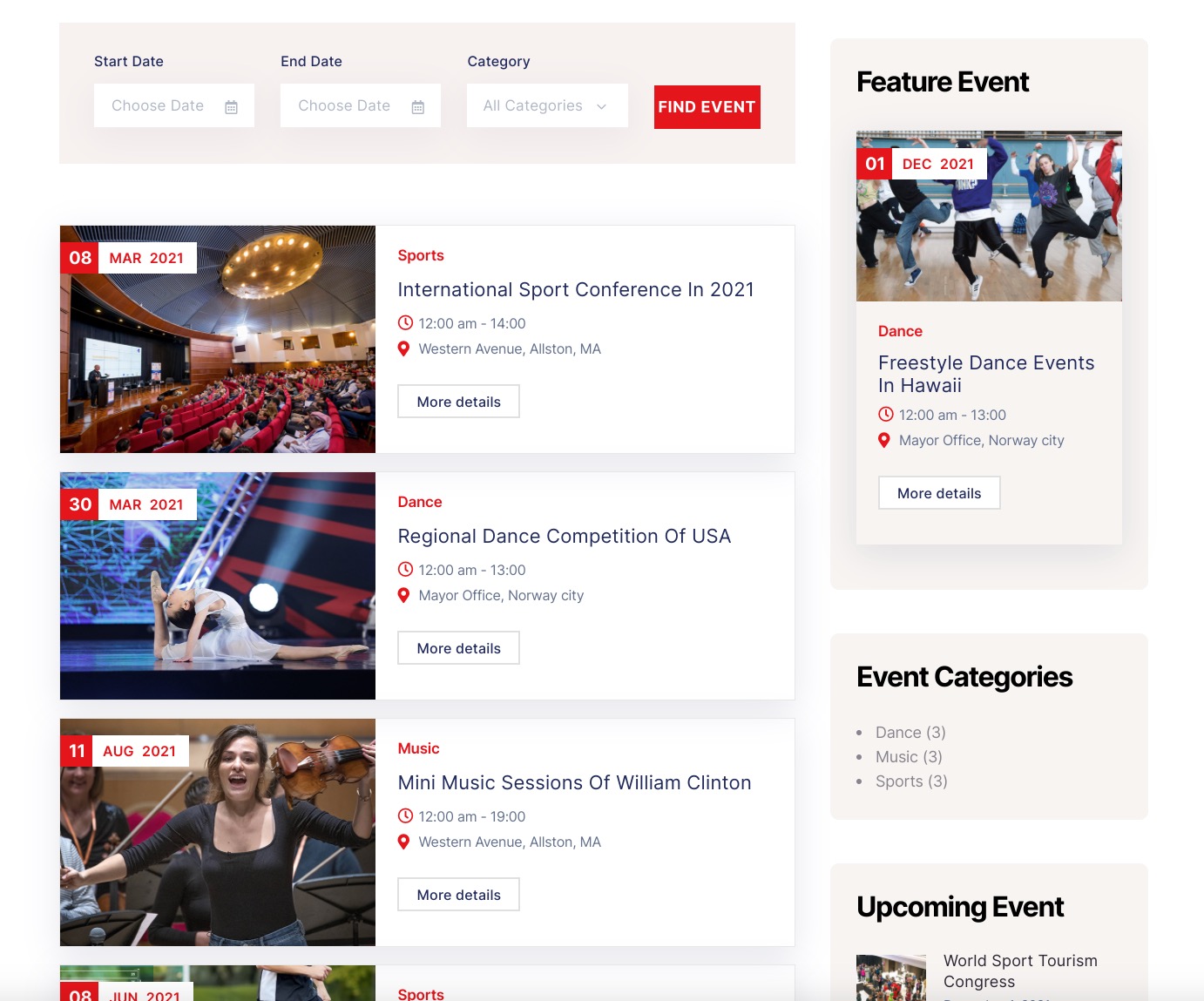 Besides, customers can select to show event listings with sidebar or no sidebar.