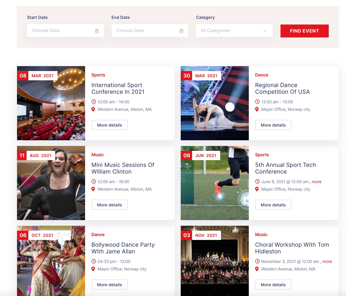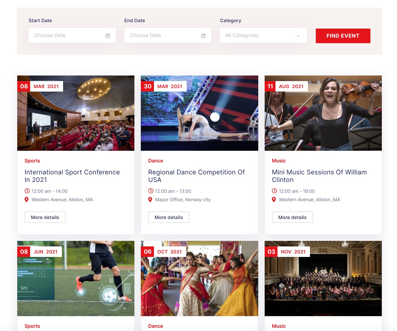 Our advanced search form will support customers filtering events based on start date, end date and category with a or two clicks. Besiders, looking for events according to customers’ needs becomes more convenient with the ready to use calendar attached in “ start date ” field and “ end date ” field.AJAX Filter Event