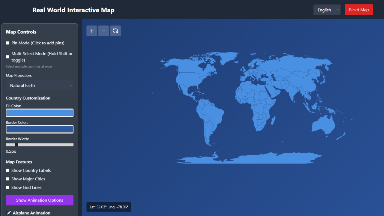 text Interactive Map Component Powered by Real World Interactive Map Includes D3.js and TopoJSON libraries Conclusion The Real World Interactive Map provides a comprehensive mapping solution that combines powerful features with user-friendly design. Its flexible architecture allows for extensive customization while maintaining excellent performance across different use cases. Whether for educational purposes, business applications, or personal projects, this application offers a robust foundation for all your geographic visualization needs.