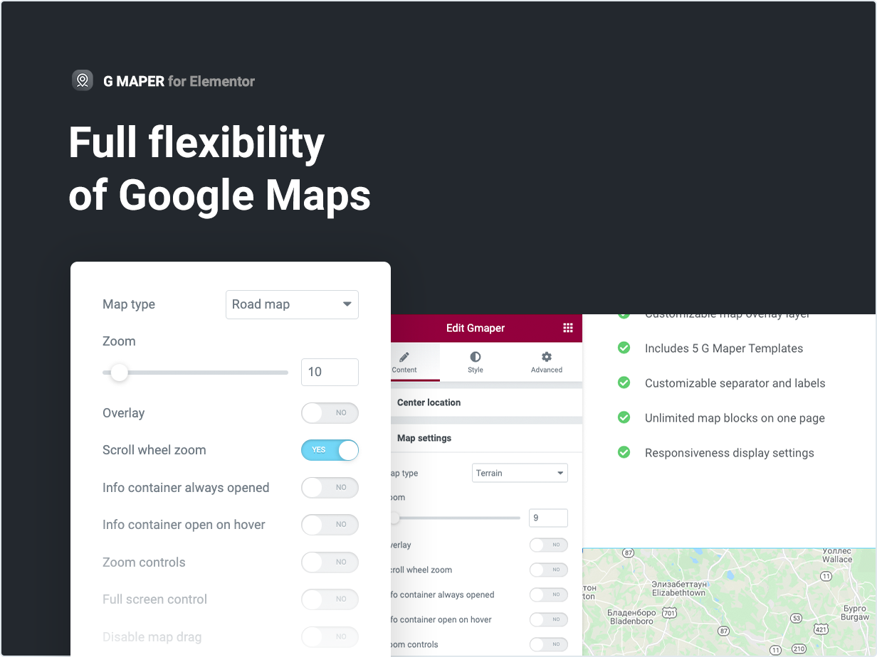Features of the Gmaper plugin for Elementor