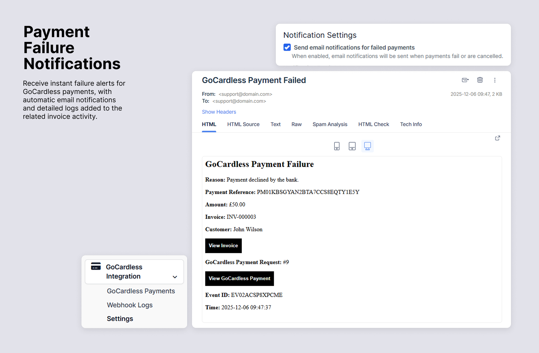 Payment Failure Notifications: If a payment fails (e.g., failed, cancelled, charged_back), the system can send an email notification to a specified address and log the failure in the invoice activity.