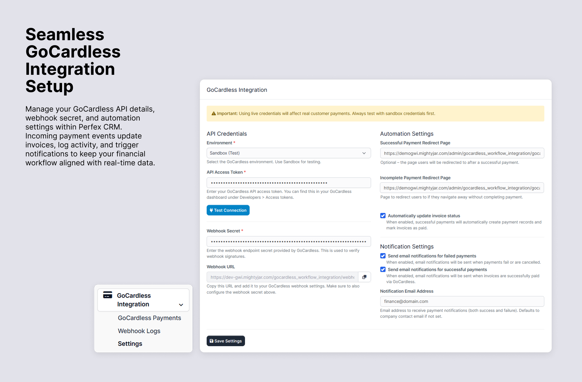 Seamless GoCardless Integration Setup: Manage your GoCardless API details, webhook secret, and automation settings directly within Perfex CRM. The module processes incoming payment events and updates invoices, logs activity, and triggers notifications to keep your financial workflow aligned with real-time GoCardless data.