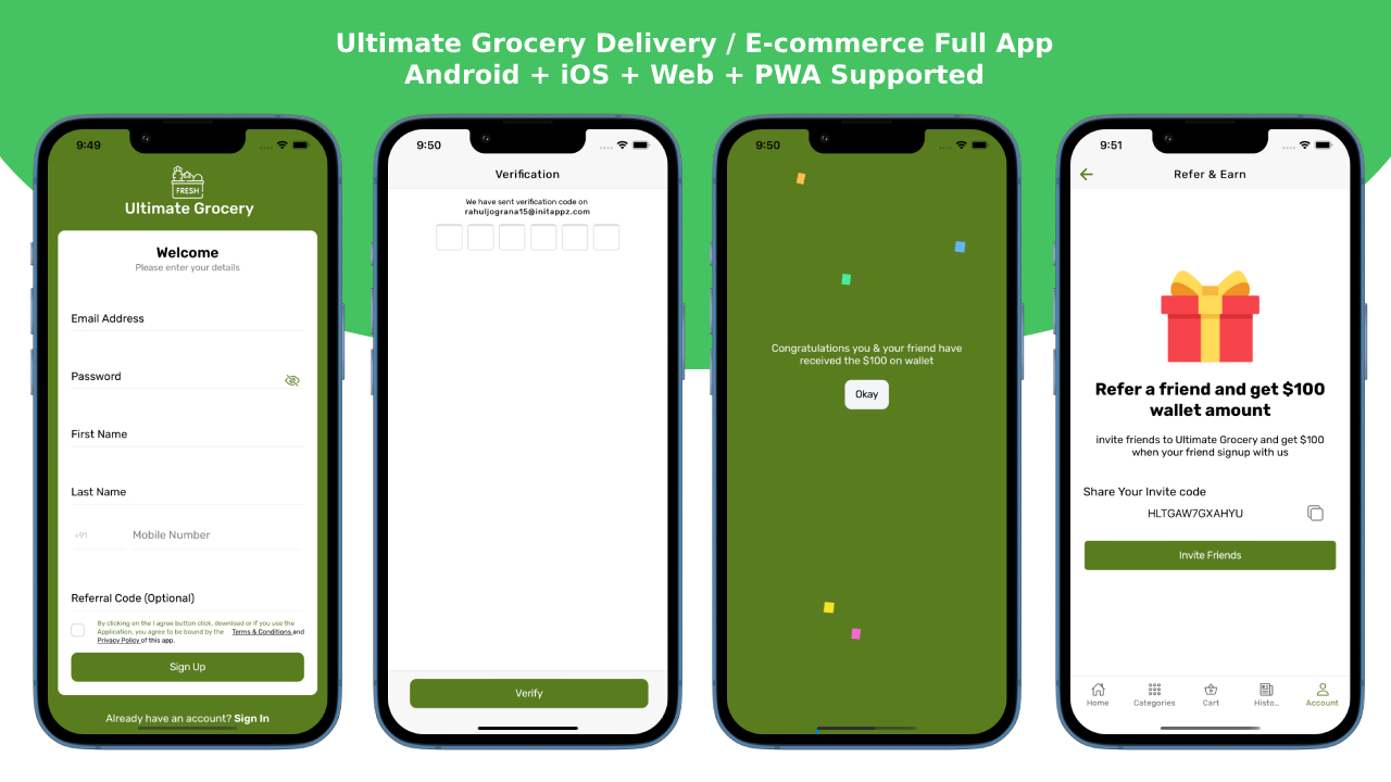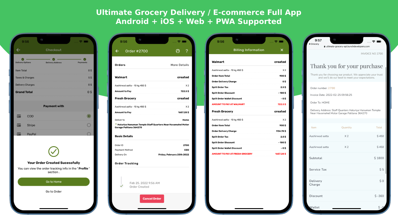 - 6 Main Apps (User App, Store App, Driver App, Administrator Panel, Store Web Panel) PWA supported.