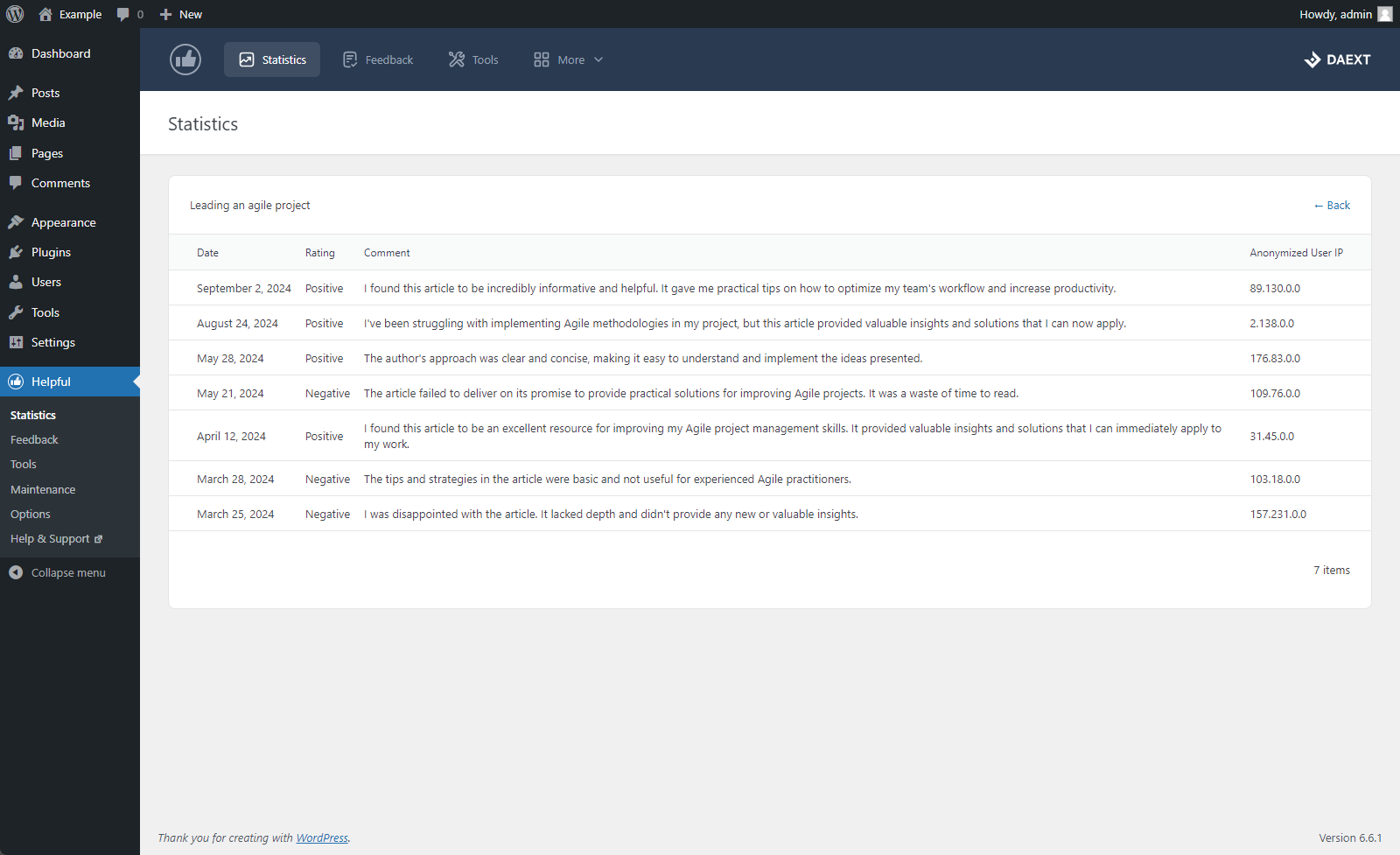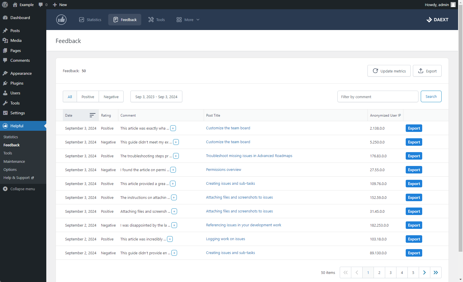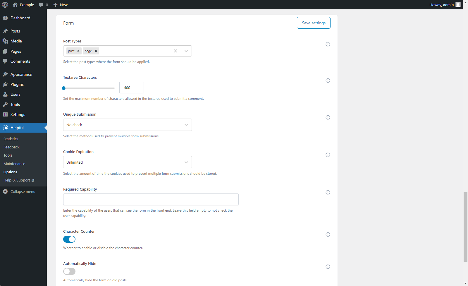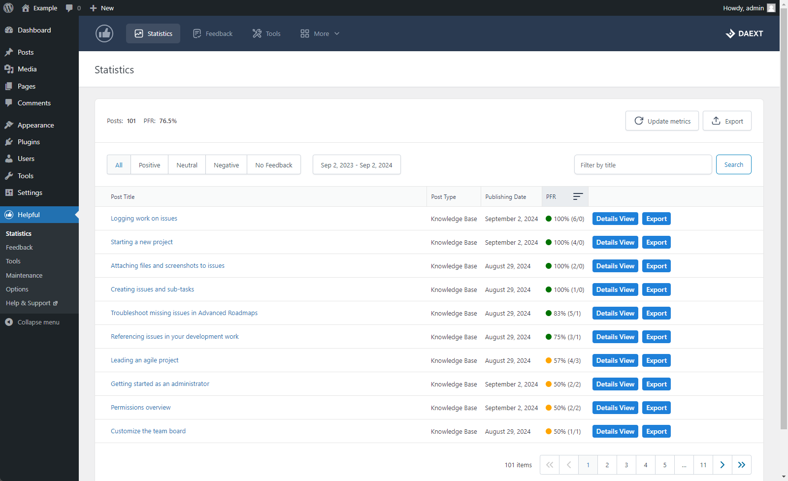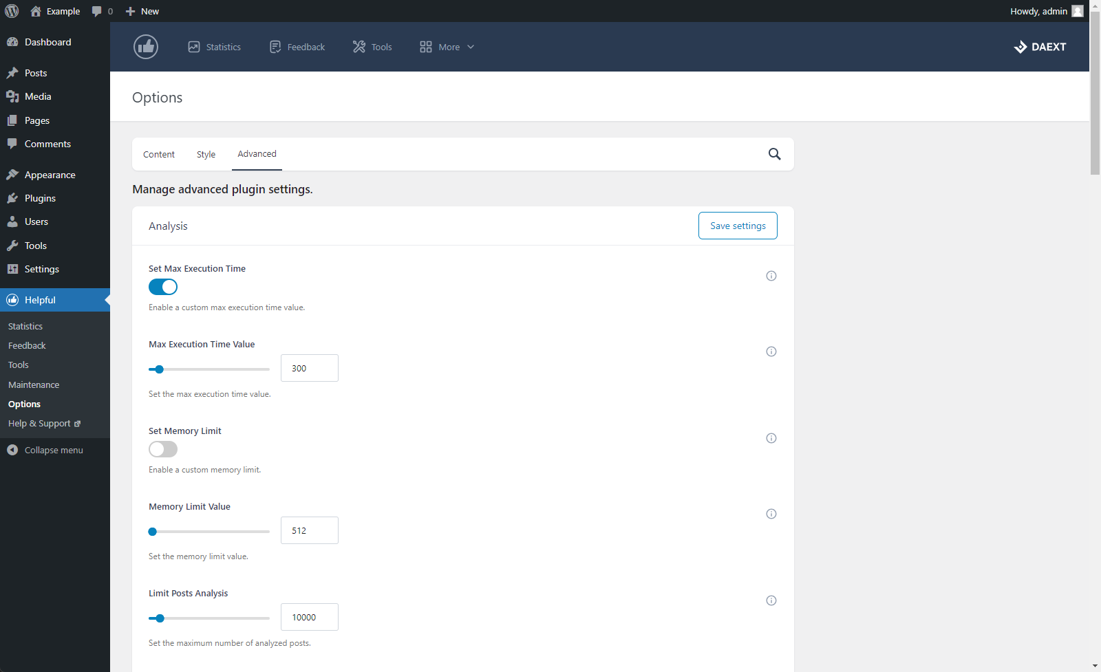 The plugin can handle a “Was this helpful?” form applied to over 100k articles. From the plugin options, you can configure the maximum number of posts displayed in the dashboard and other technical parameters used to perform the post analysis.