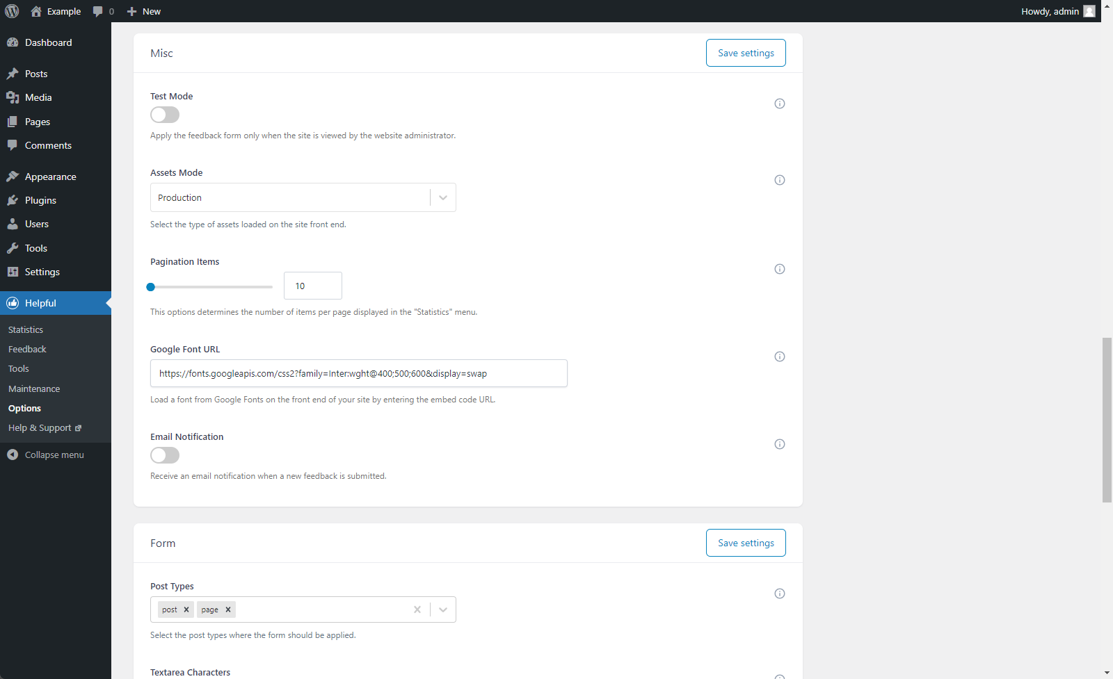 - Post Types Configuration: Apply a custom configuration to monitor only the statistics of specific post types. For example, in a typical scenario where the “Was this helpful?” form is used to understand how helpful the documentation/help pages are for your users, you can monitor the changes only to these pages.