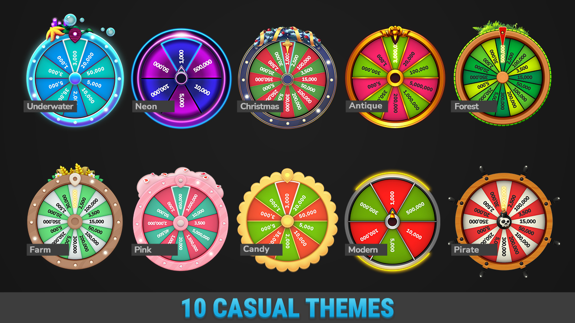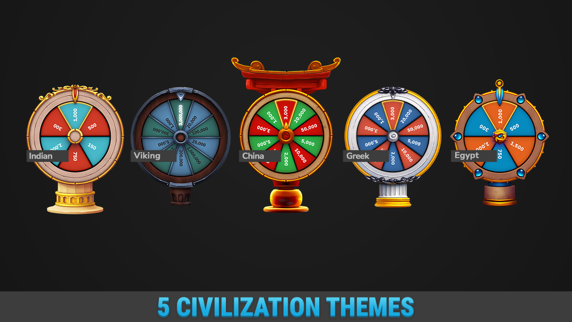 HTML Spin Wheels Mega Bundle is a powerful asset with a Fortune reward mechanics possibilities for your daily reward, bonus, and jackpot features. It included 15 different graphics styles: Modern, Underwater, Neon, Christmas, Forest, Farm, Pink, Candy, China, Pirate, Viking, Antique, Indian, Egypt, Greek and elements to create your own wheels and scenes for a different number of segments on the wheel. Fast-loading, lightweight, and easy to integrate into any web project and mobile wrapper.