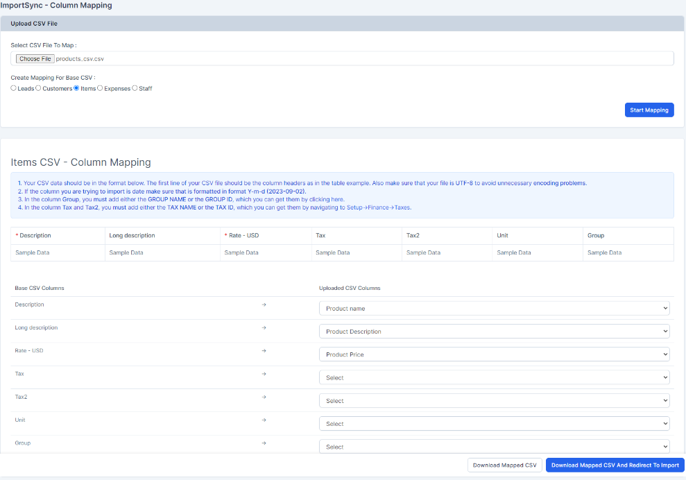 - Unleash the Power of Mapping: With ImportSync, mapping your CSV data becomes a breeze. Whether it’s Leads, Customers, Expenses, Items, or Staff, you can define the relationships with Perfex’s CSV fields effortlessly.