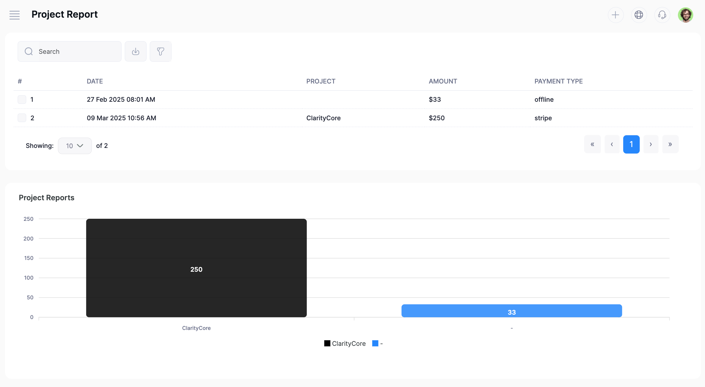 Easily track project payments with detailed reports for any time range monthly, yearly, or custom.