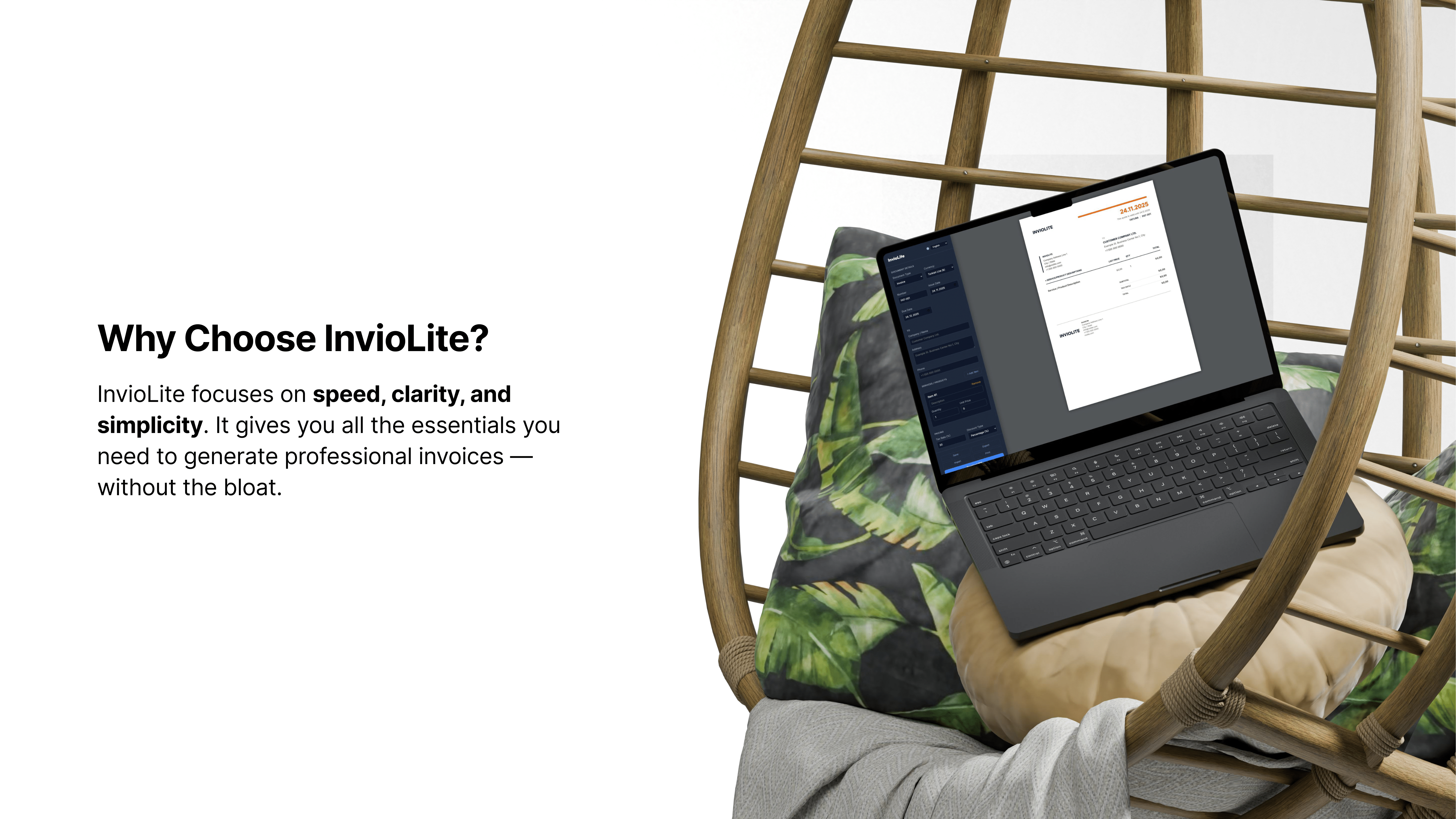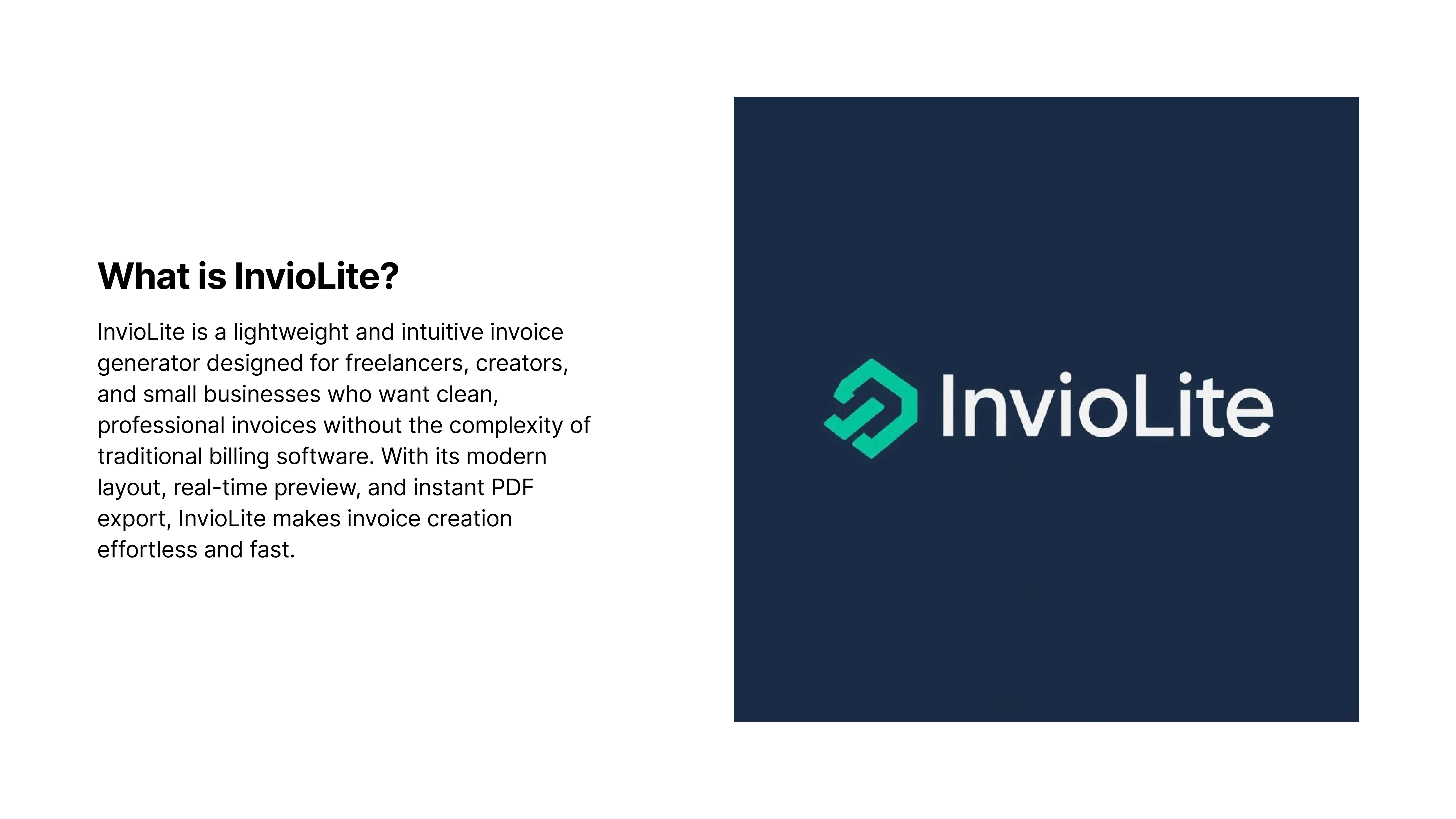 InvioLite is a modern, production-ready invoice generator built with vanilla JavaScript. Perfect for small businesses, freelancers, consultants, and anyone who needs to create professional invoices quickly without complex software or monthly subscriptions.
