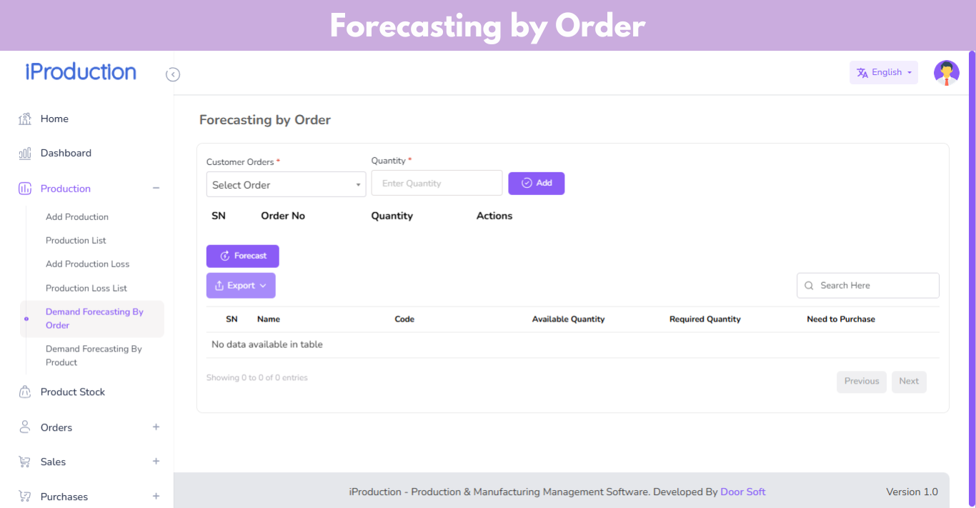 The Demand Forecasting Module enables data-driven stock requirement analysis by evaluating current inventory, pending sales orders, and future production needs in real time.