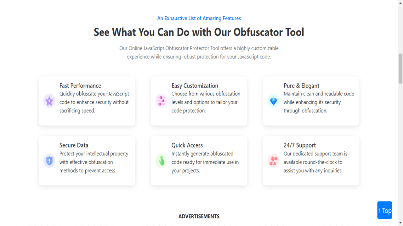 Competitive Advantage: Protecting your code can keep competitors from easily replicating features and functionality unique to your product. Key Features to Look for in a JavaScript Obfuscator When choosing a JavaScript obfuscator, consider the following features to ensure optimal code protection: