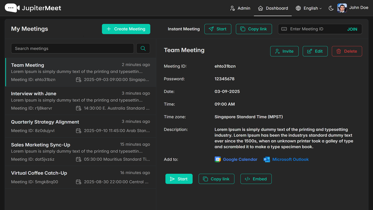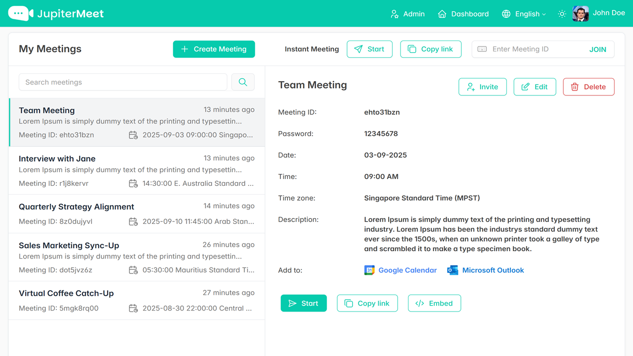 JupiterMeet is a peer-to-peer room-based real-time audio and video meeting solution in pure WebRTC with amazing features. It has it’s own signling server built with NodeJS and Socket.io. So no third party services or Apis are needed, so you can use the system to host unlimited meetings forever!