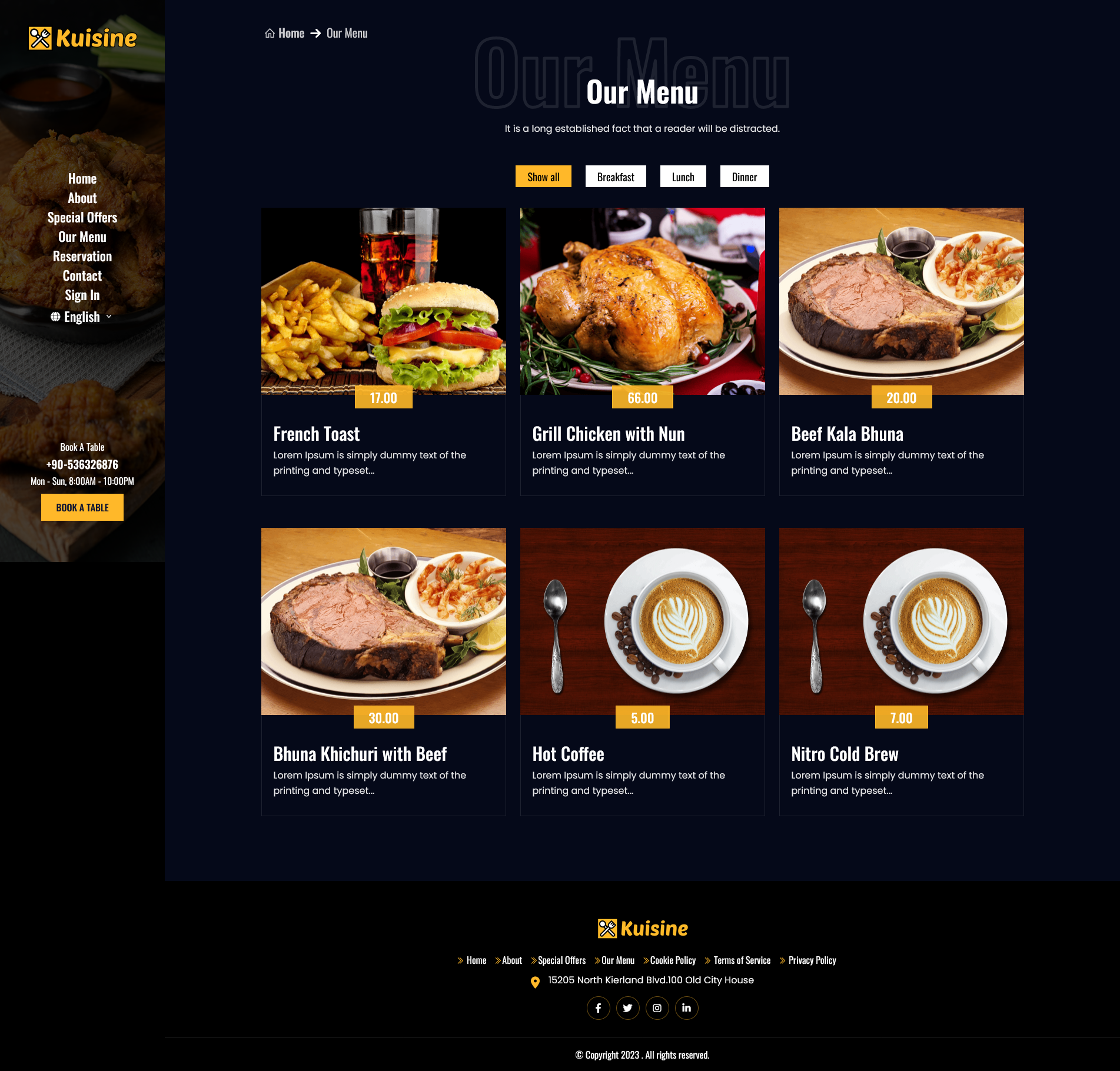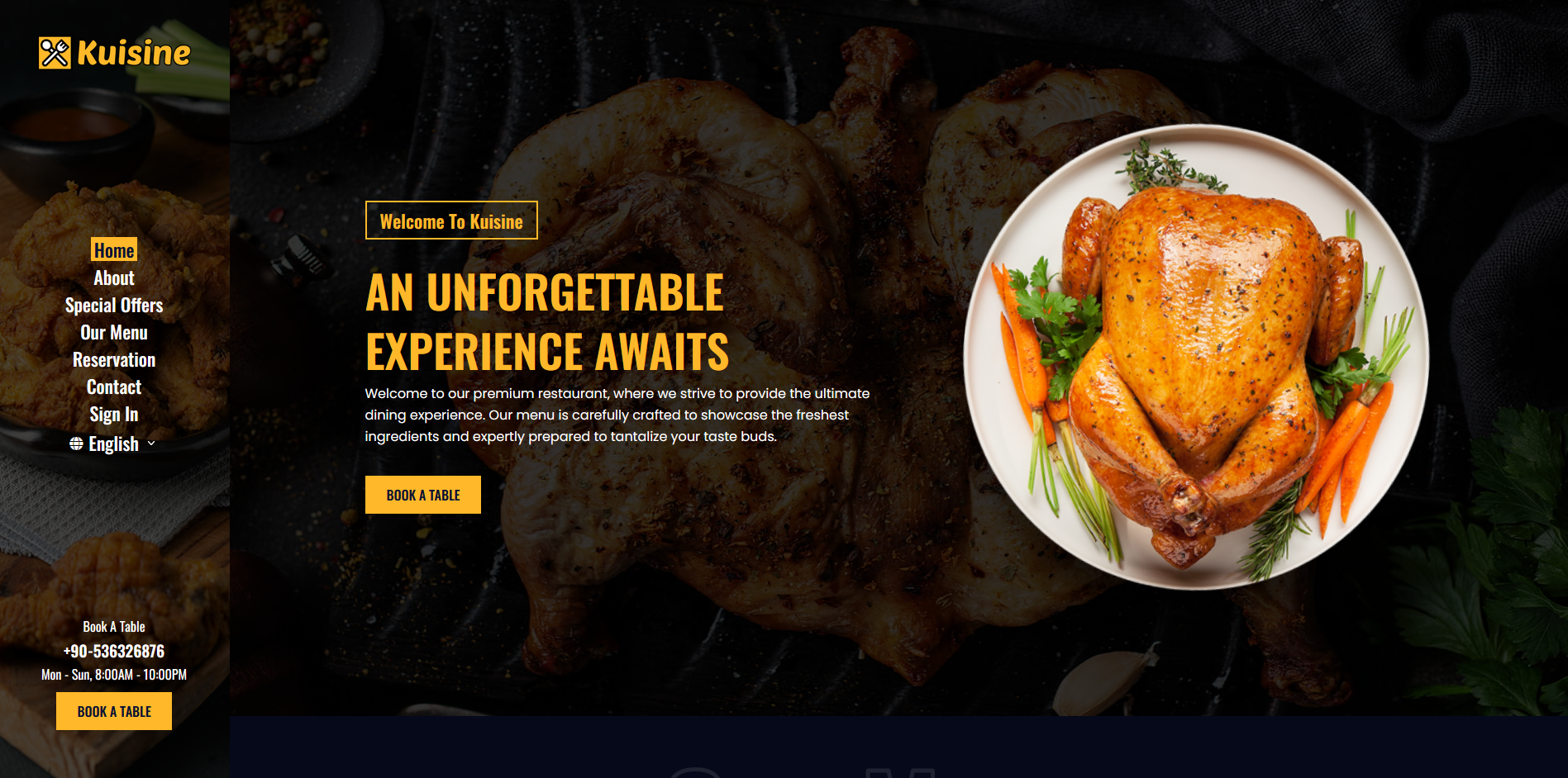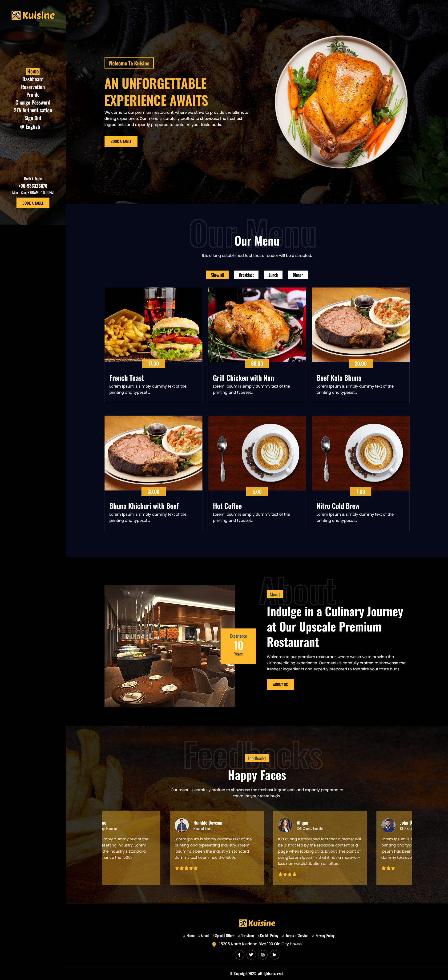 With its premium design and focus-driven interface, Kuisine offers customers a smooth, intuitive experience from browsing the menu to booking a table. The stunning landing page ensures your restaurant stands out and leaves a lasting impression.