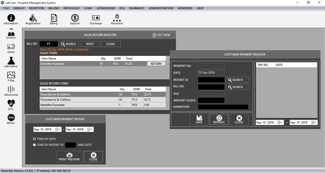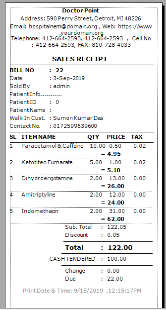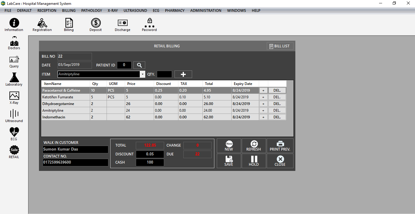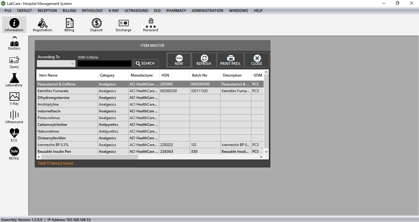 November 24, 2024 V: 1.2.1.2 UPDATE: .NET 4.6 to .NET 4.8 NEW: Birth Certificate NEW: Death Certificate NEW: Medical Certificate NEW: Vaccination Certificate UPDATE: Documentation +25 Feb, 2020 V: 1.2.1.1 New: Database Backup New: Remember username and password + 24 September, 19 Update: Software Version .NET FRAMEWORK 4.0 to .NET FRAMEWORK 4.6 Update: Database Dersion SQLCE 3.5 to SQLCE 4.0 New: Database upgrade and update documentation Update: Patient Query New: Doctor Commission New: Commission calculation New: Bed Management New: Bed View with Booking Status New: List of Item New: Retail Sales New: Add, edit Item Information New: Medicine category New: Manufacturer New: Sales return register New: Customer payment register New: Sales Report New: Customer payment report + 23 June, 18 V: 1.1.0.0 New: Windows Installer FIX: Application closing issue Update: Reporting module sql syntax Update: Report dataset Update: Report file (BabyNote,PatientBill, PatientTestBill, IncomeStatement, UltrasoundReport, LabTestReport ) + Initial release: 09 June, 17 V : 1.0.0.0