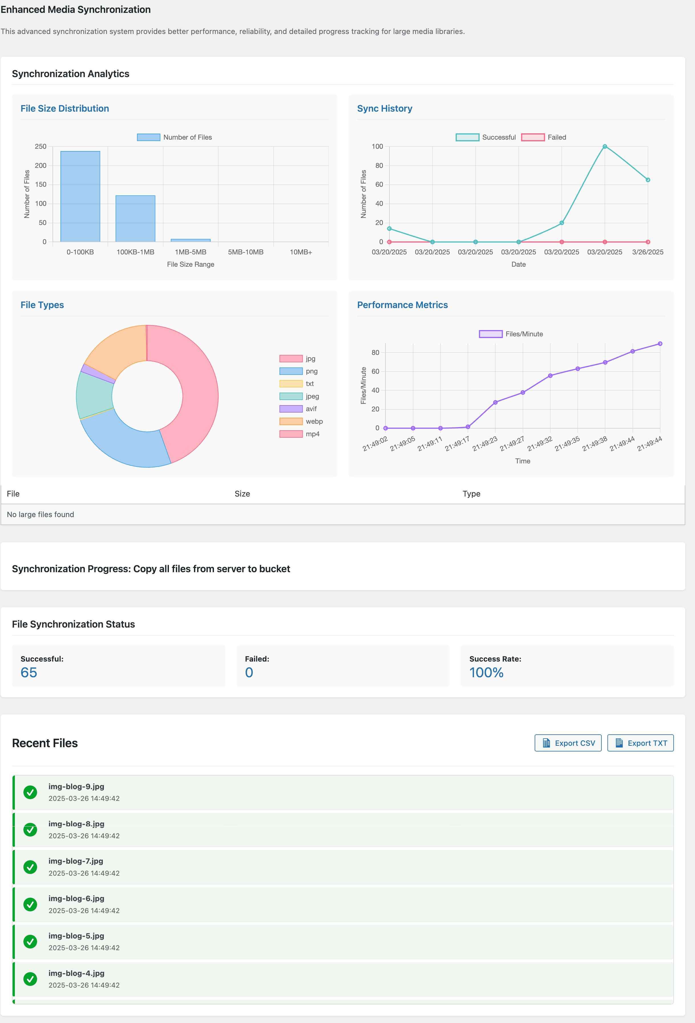 We’ve upgraded our synchronization system to be faster, more intuitive, and more informative than ever before. With interactive dashboards, real-time progress tracking, and detailed file analysis, you’ll get insights on sync speed, performance comparisons, and bottlenecks—plus smart recommendations for batch sizes and schedules. Generate comprehensive CSV/TXT reports after every operation and experience a smoother, more efficient workflow!